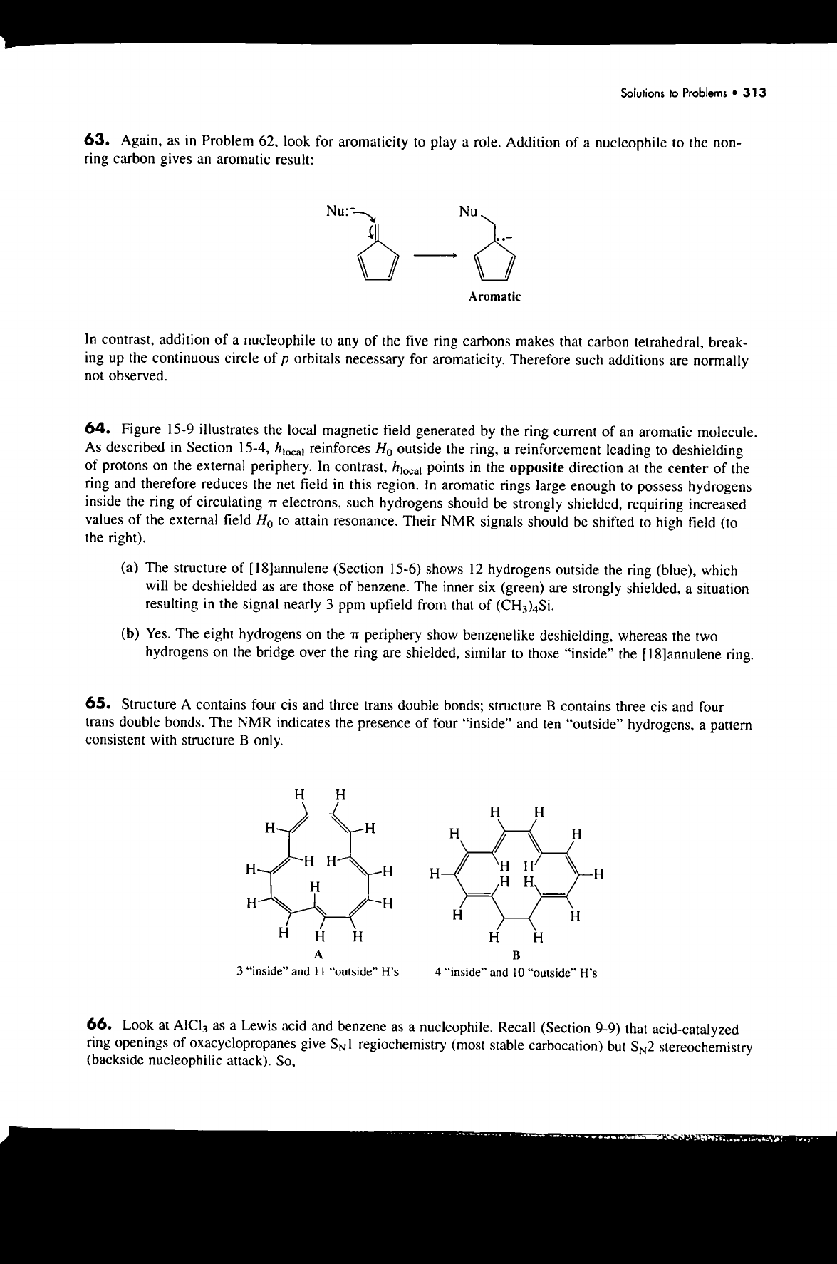 Solutions to Problems 313 63. Again, as in Problem 62, look for aromaticity to play a role. Addition of a nucleophile to the non- ring carbon gives an aromatic result: Nu: Nu Aromatic In contrast, addition of a nucleophile to any of the five ring carbons makes that carbon tetrahedral, break- ing up the continuous circle of p orbitals necessary for aromaticity. Therefore such additions are normally not observed. 64. Figure 15-9 illustrates the local magnetic field generated by the ring current of an aromatic molecule. As described in Section 15-4, reinforces H₀ outside the ring, a reinforcement leading to deshielding of protons on the external periphery. In contrast, points in the opposite direction at the center of the ring and therefore reduces the net field in this region. In aromatic rings large enough to possess hydrogens inside the ring of circulating π electrons, such hydrogens should be strongly shielded, requiring increased values of the external field H₀ to attain resonance. Their NMR signals should be shifted to high field (to the right). (a) The structure of (Section 15-6) shows 12 hydrogens outside the ring (blue), which will be deshielded as are those of benzene. The inner six (green) are strongly shielded, a situation resulting in the signal nearly 3 ppm upfield from that of (CH₃)₄Si. (b) Yes. The eight hydrogens on the periphery show benzenelike deshielding, whereas the two hydrogens on the bridge over the ring are shielded, similar to those "inside" the Jannulene ring. 65. Structure A contains four cis and three trans double bonds; structure B contains three cis and four trans double bonds. The NMR indicates the presence of four "inside" and ten "outside" hydrogens, a pattern consistent with structure B only. H H H H H H H H H H H H H H H H H H H H H H H H H H H H A B 3 "inside" and 11 "outside" H's 4 "inside" and 10 "outside" H's 66. Look at as a Lewis acid and benzene as a nucleophile. Recall (Section 9-9) that acid-catalyzed ring openings of oxacyclopropanes give regiochemistry (most stable carbocation) but SN2 stereochemistry (backside nucleophilic attack). So,