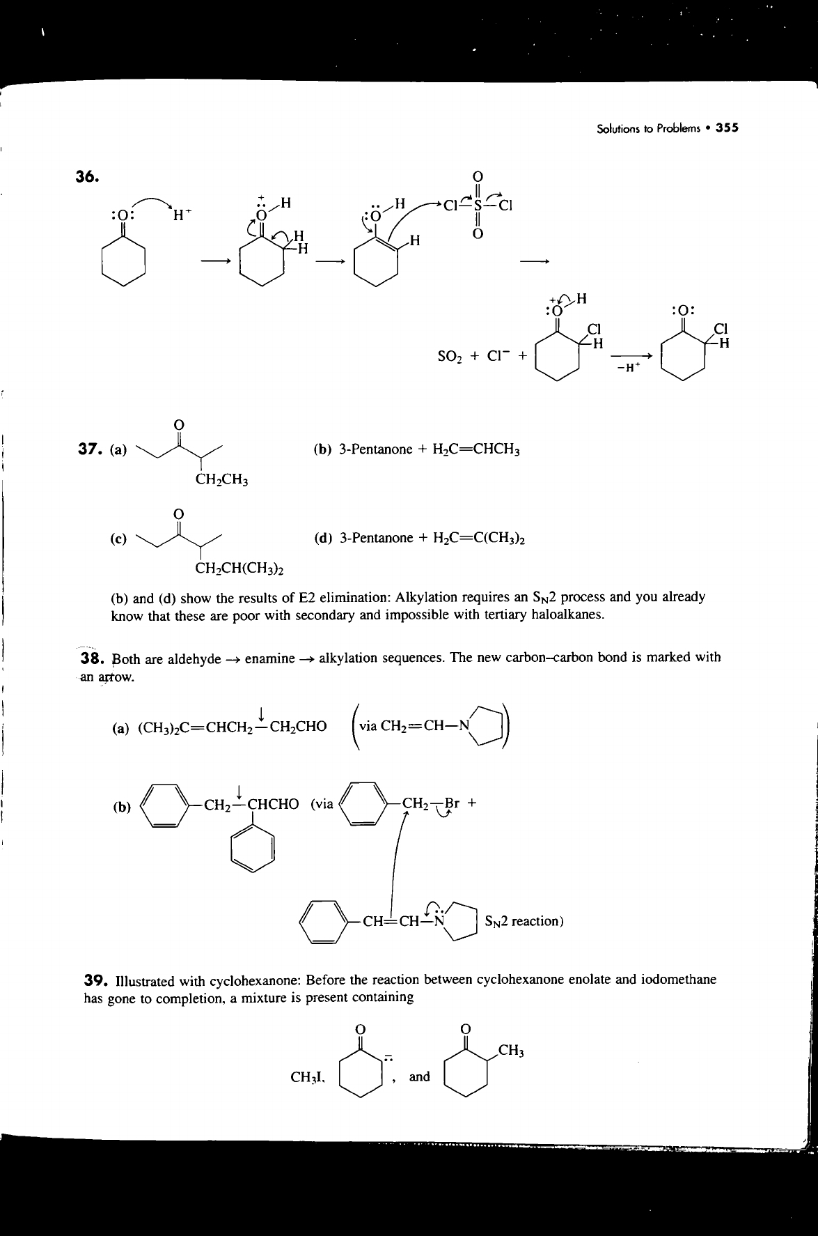 Solutions to Problems 355 36. 0 + H H CI S H⁺ + :0: H O H H + H :0 :0: H H SO₂ + + 37. (a) (b) 3-Pentanone + H₂C=CHCH₃ CH₂CH₃ (c) (d) 3-Pentanone + H₂C=C(CH₃)₂ CH₂CH(CH₃)₂ (b) and (d) show the results of E2 elimination: Alkylation requires an SN2 process and you already know that these are poor with secondary and impossible with tertiary haloalkanes. 38. Both are aldehyde enamine alkylation sequences. The new carbon-carbon bond is marked with an arrow. (a) (b) CH₂ CHCHO (via CH₂ Br + CH=CH-N SN2 reaction) 39. Illustrated with cyclohexanone: Before the reaction between cyclohexanone enolate and iodomethane has gone to completion, a mixture is present containing O 0 CH₃ : CH₃I, , and