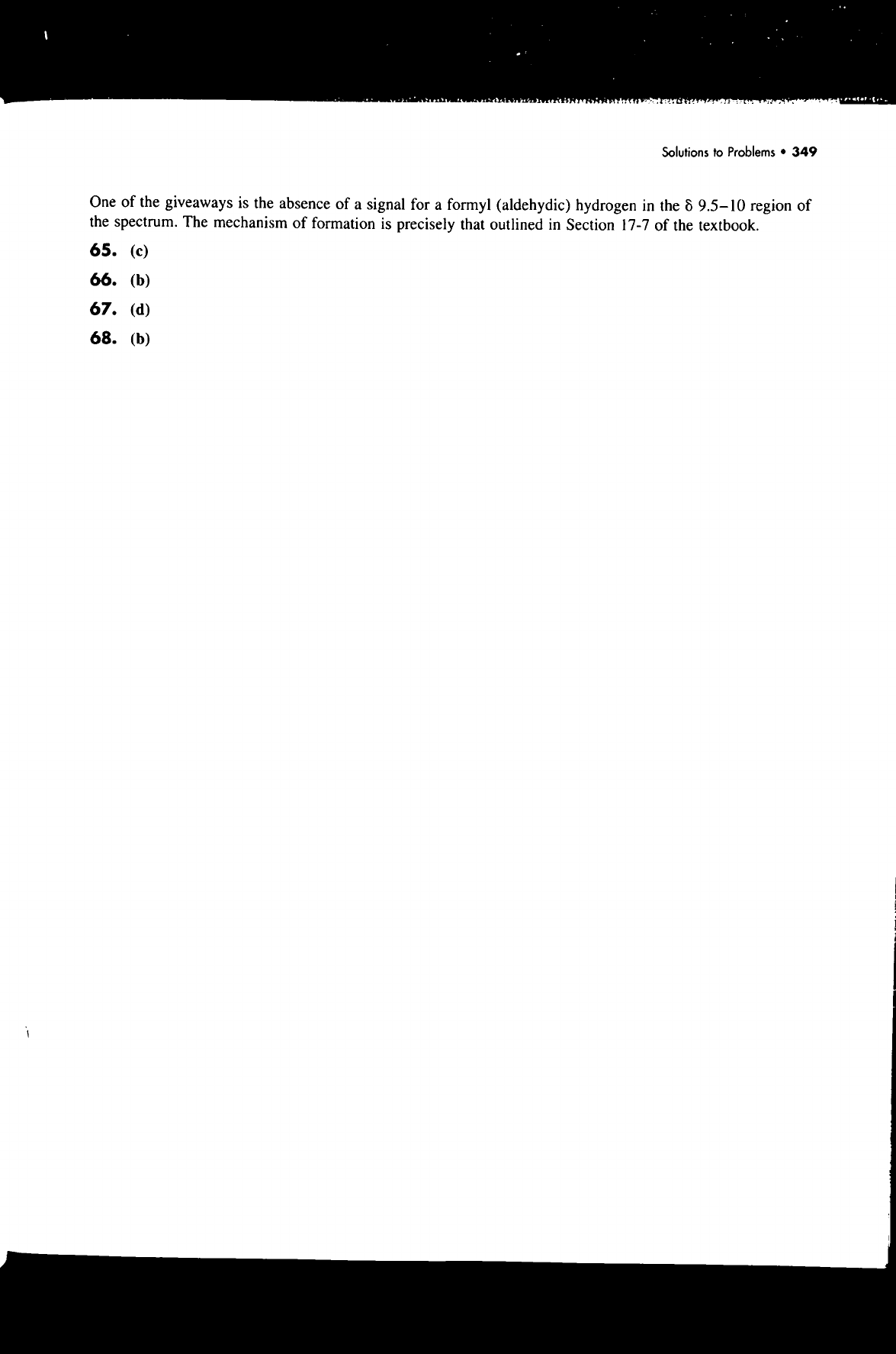 Solutions to Problems 349 One of the giveaways is the absence of a signal for a formyl (aldehydic) hydrogen in the δ 9.5-10 region of the spectrum. The mechanism of formation is precisely that outlined in Section 17-7 of the textbook. 65. (c) 66. (b) 67. (d) 68. (b)