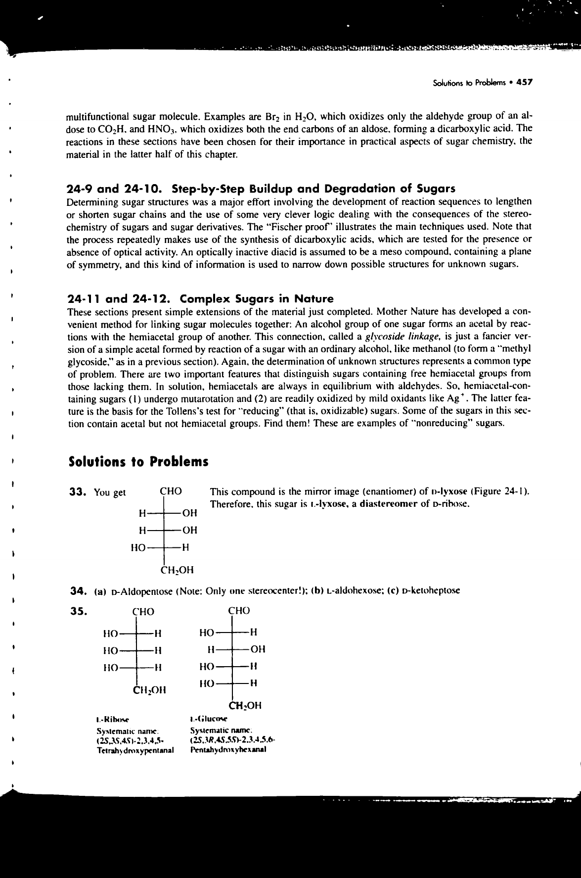 Solutions to Problems 457 multifunctional sugar molecule. Examples are Br₂ in H₂O, which oxidizes only the aldehyde group of an al- dose to CO₂H, and which oxidizes both the end carbons of an forming a dicarboxylic acid. The reactions in these sections have been chosen for their importance in practical aspects of sugar chemistry, the material in the latter half of this chapter. 24-9 and 24-10. Step-by-Step Buildup and Degradation of Sugars Determining sugar structures was a major effort involving the development of reaction sequences to lengthen or shorten sugar chains and the use of some very clever logic dealing with the consequences of the stereo- chemistry of sugars and sugar derivatives. The "Fischer proof" illustrates the main techniques used. Note that the process repeatedly makes use of the synthesis of dicarboxylic acids, which are tested for the presence or absence of optical activity. An optically inactive diacid is assumed to be a meso containing a plane of symmetry, and this kind of information is used to narrow down possible structures for unknown sugars. 24-11 and 24-12. Complex Sugars in Nature These sections present simple extensions of the material just completed. Mother Nature has developed a con- venient method for linking sugar molecules together: An alcohol group of one sugar forms an acetal by reac- tions with the hemiacetal group of another. This connection, called a glycoside linkage, is just a fancier ver- sion of a simple acetal formed by reaction of a sugar with an ordinary alcohol, like methanol (to form a "methyl glycoside." as in a previous section). Again, the determination of unknown structures represents a common type of problem. There are two important features that distinguish sugars containing free hemiacetal groups from those lacking them. In solution, hemiacetals are always in equilibrium with aldehydes. hemiacetal-con- taining sugars (1) undergo mutarotation and (2) are readily oxidized by mild oxidants like The latter fea- ture is the basis for the Tollens's test for "reducing" (that is, oxidizable) sugars. Some of the sugars in this sec- tion contain acetal but not hemiacetal groups. Find them! These are examples of "nonreducing" sugars. Solutions to Problems 33. You get CHO This compound is the mirror image (enantiomer) of (Figure 24-1). this sugar is L-lyxose, a diastereomer of D-ribose. H OH H OH HO H CH₂OH 34. (a) D-Aldopentose (Note: Only one (b) (c) 35. CHO CHO HO H HO H HO H H OH HO H H HO H CH₂OH CH₂OH L-Ribose Systematic name: Systematic name: Pentahydroxyhexanal