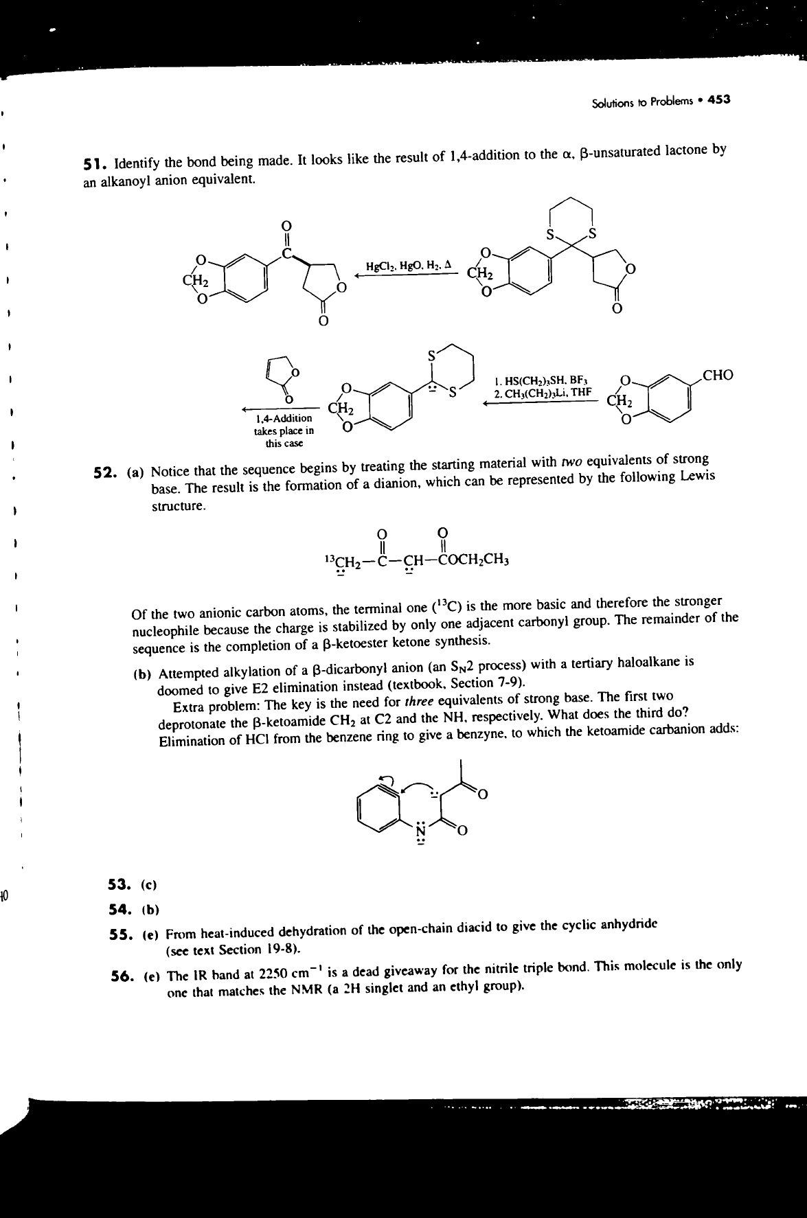 Solutions to Problems 453 51. Identify the bond being made. It looks like the result of 1,4-addition to the α, lactone by an alkanoyl anion equivalent. S S C 0 HgO. CH₂ H₂ 0 0 S 1. BF₃ CHO 0 S 2. CH₃(CH₂)₃Li, THF H₂ CH₂ takes place in 0 this case 52. (a) Notice that the sequence begins by treating the starting material with two equivalents of strong base. The result is the formation of a dianion, which can be represented by the following Lewis structure. Of the two anionic carbon atoms, the terminal one (¹³C) is the more basic and therefore the stronger nucleophile because the charge is stabilized by only one adjacent carbonyl group. The remainder of the sequence is the completion of a ß-ketoester ketone synthesis. (b) Attempted alkylation of a ß-dicarbonyl anion (an SN2 process) with a tertiary haloalkane is doomed to give E2 elimination instead (textbook, Section 7-9). Extra problem: The key is the need for three equivalents of strong base. The first two deprotonate the CH₂ at C2 and the respectively. What does the third do? Elimination of HCI from the benzene ring to give a to which the ketoamide carbanion adds: 0 N 0 53. (c) 54. (b) 55. (e) From heat-induced dehydration of the open-chain diacid to give the cyclic anhydride (see text Section 19-8). 56. (e) The IR band at 2250 cm⁻¹ is a dead giveaway for the nitrile triple bond. This molecule is the only one that matches the NMR (a 2H singlet and an ethyl group).