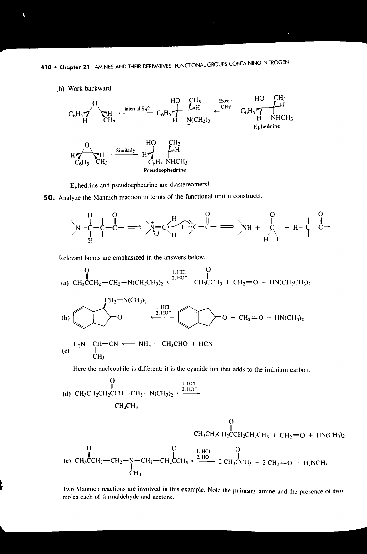 410 Chapter 21 AMINES AND THEIR DERIVATIVES: FUNCTIONAL GROUPS CONTAINING NITROGEN (b) Work backward. 0 CH₃ Excess HO CH₃ Internal SN2 H CH₃I H C₆H₅ H C₆H₅ C₆H₅ H CH₃ H N(CH₃)₃ H NHCH₃ + Ephedrine CH₃ Similarly H H H H C₆H₅ CH₃ C₆H₅ Pseudoephedrine Ephedrine and pseudoephedrine are diastereomers! 50. Analyze the Mannich reaction in terms of the functional unit it constructs. H 0 H + N-C-C-C- N C + C C NH + C + H-C-C- H H H H Relevant bonds are emphasized in the answers below. () 1. HCI 0 2. (a) CH₃CCH₃ + + HN(CH₂CH₃)₂ 1. HCI (b) 0 + + HN(CH₃)₂ H₂N-CH-CN + CH₃CHO + HCN (c) CH₃ Here the nucleophile is it is the cyanide ion that adds to the iminium carbon. () 1. HCI (d) CH₂CH₃ () + + HN(CH₃)₂ () 1. HCI () (e) 2. HO 2 + + CH₃ Two Mannich reactions are involved in this example. Note the primary amine and the presence of two moles each of formaldehyde and acetone.