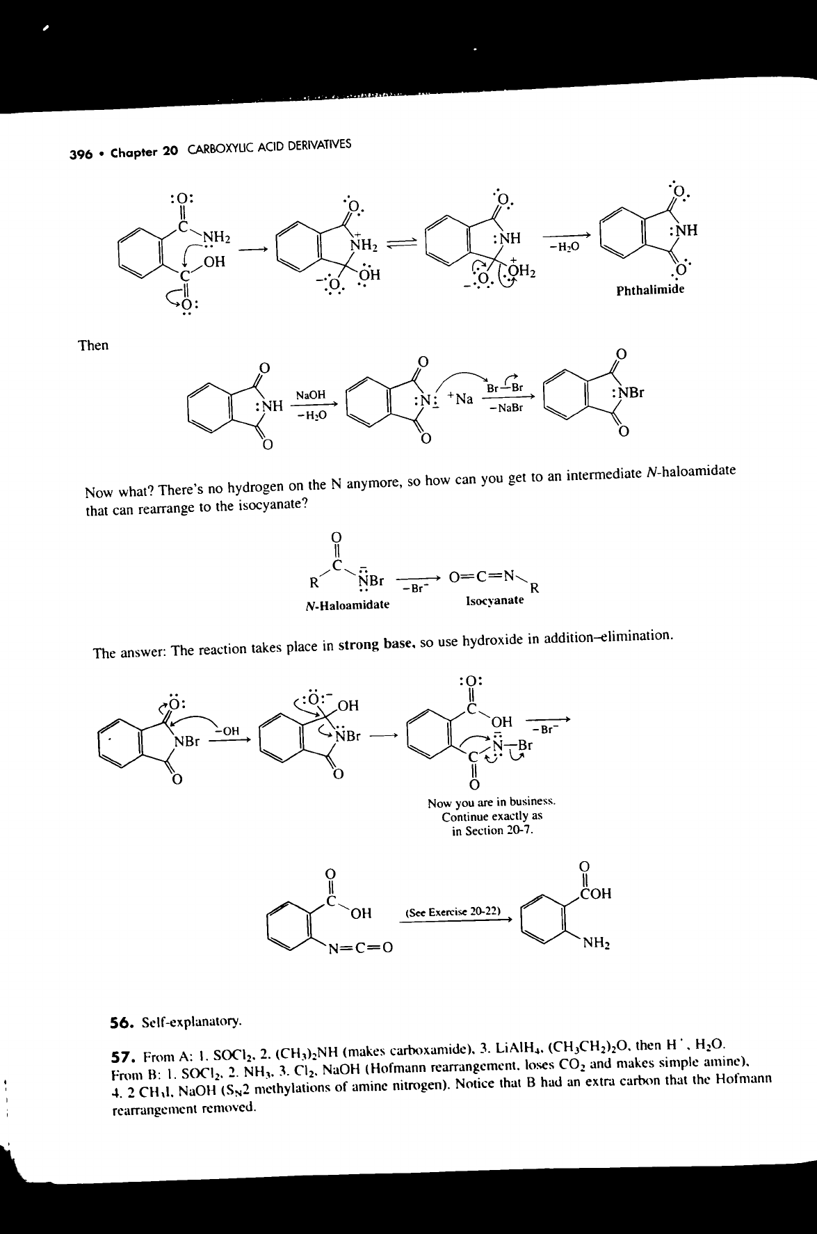 396 Chapter 20 CARBOXYLIC ACID DERIVATIVES :0: O. C NH₂ + NH₂ : NH : NH OH C + OH :0. :0. OH₂ O: Phthalimide Then O NaOH :NH :N: + Na :NBr -NaBr O O Now what? There's no hydrogen on the N anymore, so how can you get to an intermediate N-haloamidate that can rearrange to the isocyanate? C R NBr 0=C=N R N-Haloamidate Isocyanate The answer: The reaction takes place in strong base, so use hydroxide in addition-elimination. :0: :0:- OH C -OH NBr OH NBr A N Br C O Now you are in business. Continue exactly as in Section 20-7. O O C COH OH (See Exercise 20-22) N=C=0 = NH₂ 56. Self-explanatory. 57. From A: 2. (CH₃)₂NH (makes 3. then H₂O. From B: 1. 2. 3. NaOH (Hofmann rearrangement. loses and makes simple amine), 4. 2 NaOH methylations of amine nitrogen). Notice that B had an extra carbon that the Hofmann rearrangement removed.