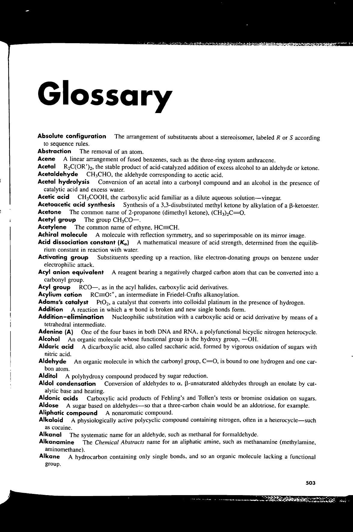 Glossary Absolute configuration The arrangement of substituents about a stereoisomer, labeled R or S according to sequence rules. Abstraction The removal of an atom. Acene A linear arrangement of fused benzenes, such as the three-ring system anthracene. Acetal R₂C(OR')₂, the stable product of acid-catalyzed addition of excess alcohol to an aldehyde or ketone. Acetaldehyde CH₃CHO, the aldehyde corresponding to acetic acid. Acetal hydrolysis Conversion of an acetal into a carbonyl compound and an alcohol in the presence of catalytic acid and excess water. Acetic acid CH₃COOH, the carboxylic acid familiar as a dilute aqueous solution-vinegar. Acetoacetic acid synthesis Synthesis of a 3,3-disubstituted methyl ketone by alkylation of a ß-ketoester. Acetone The common name of 2-propanone (dimethyl ketone), Acetyl group The group Acetylene The common name of ethyne, HC=CH. Achiral molecule A molecule with reflection symmetry, and so superimposable on its mirror image. Acid dissociation constant A mathematical measure of acid strength, determined from the equilib- rium constant in reaction with water. Activating group Substituents speeding up a reaction, like electron-donating groups on benzene under electrophilic attack. Acyl anion equivalent A reagent bearing a negatively charged carbon atom that can be converted into a carbonyl group. Acyl group RCO-, as in the acyl halides, carboxylic acid derivatives. Acylium cation an intermediate in Friedel-Crafts alkanoylation. Adams's catalyst PtO₂, a catalyst that converts into colloidal platinum in the presence of hydrogen. Addition A reaction in which a bond is broken and new single bonds form. Nucleophilic substitution with a carboxylic acid or acid derivative by means of a tetrahedral intermediate. Adenine (A) One of the four bases in both DNA and a polyfunctional bicyclic nitrogen heterocycle. Alcohol An organic molecule whose functional group is the hydroxy group, -OH. Aldaric acid A dicarboxylic acid, also called saccharic acid, formed by vigorous oxidation of sugars with nitric acid. Aldehyde An organic molecule in which the carbonyl group, C=0, is bound to one hydrogen and one car- bon atom. Alditol A polyhydroxy compound produced by sugar reduction. Aldol condensation Conversion of aldehydes to α, aldehydes through an enolate by cat- alytic base and heating. Aldonic acids Carboxylic acid products of Fehling's and Tollen's tests or bromine oxidation on sugars. Aldose A sugar based on aldehydes-so that a three-carbon chain would be an aldotriose, for example. Aliphatic compound A nonaromatic compound. Alkaloid A physiologically active polycyclic compound containing nitrogen, often in a heterocycle-such as cocaine. Alkanal The systematic name for an aldehyde, such as methanal for formaldehyde. Alkanamine The Chemical Abstracts name for an aliphatic amine, such as methanamine (methylamine, aminomethane). Alkane A hydrocarbon containing only single and so an organic molecule lacking a functional group. 503