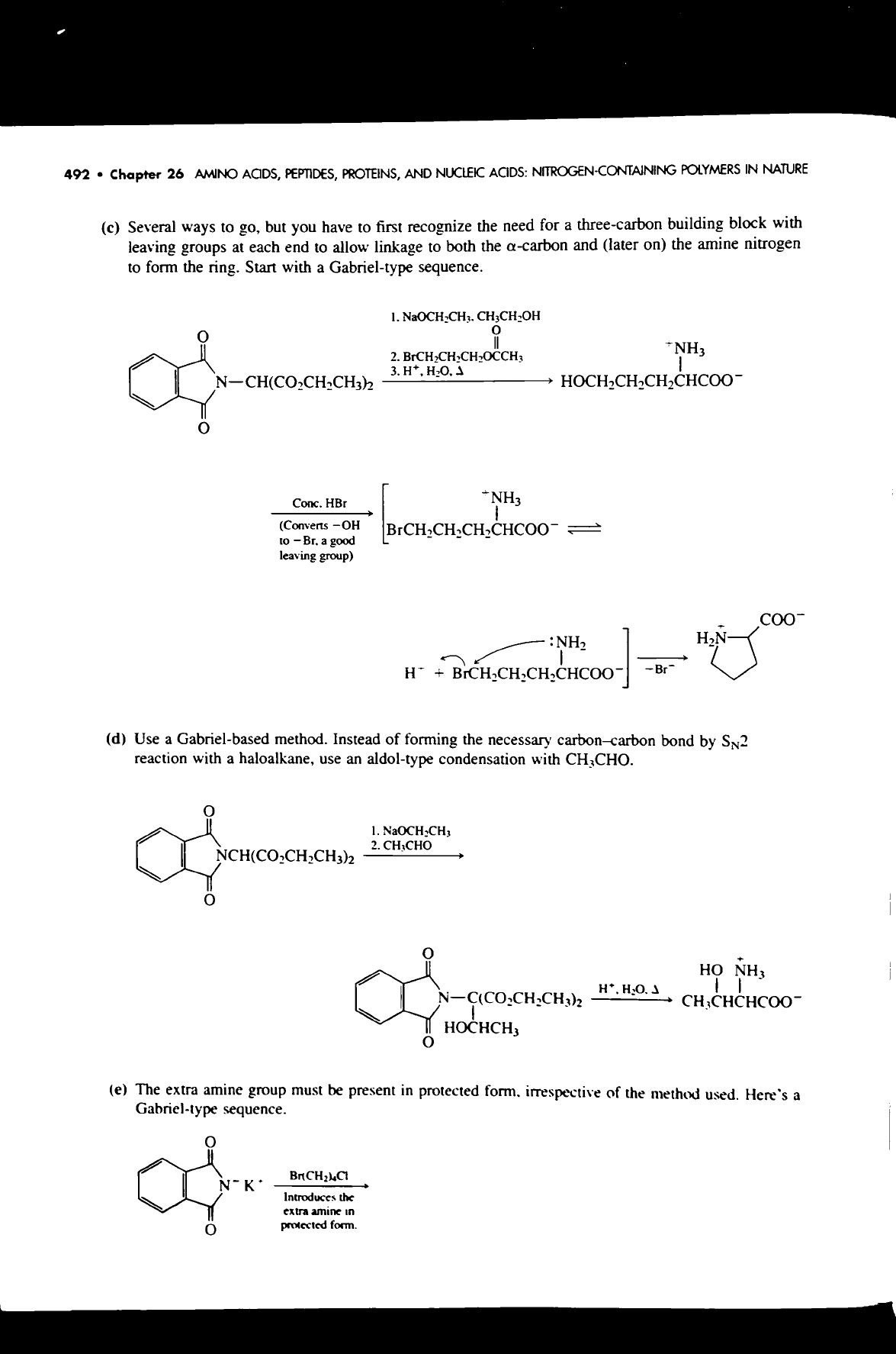 492 Chapter 26 AMINO ACIDS, PEPTIDES, PROTEINS, AND NUCLEIC ACIDS: NITROGEN-CONTAINING POLYMERS IN NATURE (c) Several ways to go, but you have to first recognize the need for a three-carbon building block with leaving groups at each end to allow linkage to both the α-carbon and (later on) the amine nitrogen to form the ring. Start with a Gabriel-type sequence. 1. NaOCH₂CH₃. 2. 3. 1 N-CH(CO₂CH₂CH₃)₂ 0 Conc. HBr (Converts OH to - Br. a good leaving group) :NH₂ + (d) Use a Gabriel-based method. Instead of forming the necessary carbon-carbon bond by SN2 reaction with a haloalkane, use an aldol-type condensation with CH₃CHO. 1. NaOCH₂CH₃ 2. NCH(CO₂CH₂CH₃)₂ HO N HOCHCH₃ (e) The extra amine group must be present in protected form. irrespective of the method used. Here's a Gabriel-type sequence. 0 Introduces the extra amine in 0 protected form.