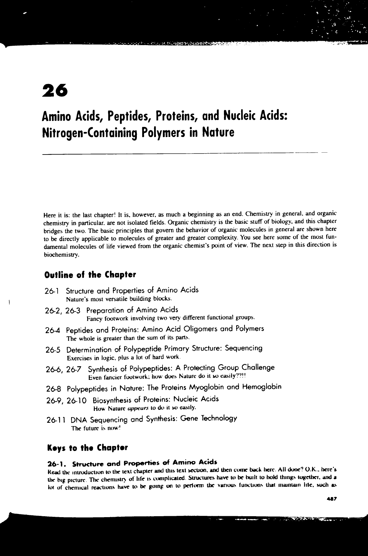 26 Amino Acids, Peptides, Proteins, and Nucleic Acids: Nitrogen-Containing Polymers in Nature Here it is: the last chapter! It is, however, as much a beginning as an end. Chemistry in general. and organic chemistry in particular. are not isolated fields. Organic chemistry is the basic stuff of biology, and this chapter bridges the two. The basic principles that govern the behavior of organic molecules in general are shown here to be directly applicable to molecules of greater and greater complexity. You see here some of the most fun- damental molecules of life viewed from the organic chemist's point of view. The next step in this direction is biochemistry. Outline of the Chapter 26-1 Structure and Properties of Amino Acids Nature's most versatile building blocks. 26-2, 26-3 Preparation of Amino Acids Fancy footwork involving two very different functional groups. 26-4 Peptides and Proteins: Amino Acid Oligomers and Polymers The whole is greater than the sum of its parts. 26-5 Determination of Polypeptide Primary Structure: Sequencing Exercises in logic, plus a lot of hard work. 26-6, 26-7 Synthesis of Polypeptides: A Protecting Group Challenge Even fancier footwork: how does Nature do it so easily??!! 26-8 Polypeptides in Nature: The Proteins Myoglobin and Hemoglobin 26-9, 26-10 Biosynthesis of Proteins: Nucleic Acids How Nature appears to do it easily. 26-11 DNA Sequencing and Synthesis: Gene Technology The future is now! Keys to the Chapter Structure and Properties of Amino Acids Read the introduction to the text chapter and this text section. and then come back here. All done? O.K., here's the big picture. The chemistry of life IS complicated. Structures have to be built to hold things together. and a lot of chemical reactions have to be going on to perform the various functions that maintain such as 487