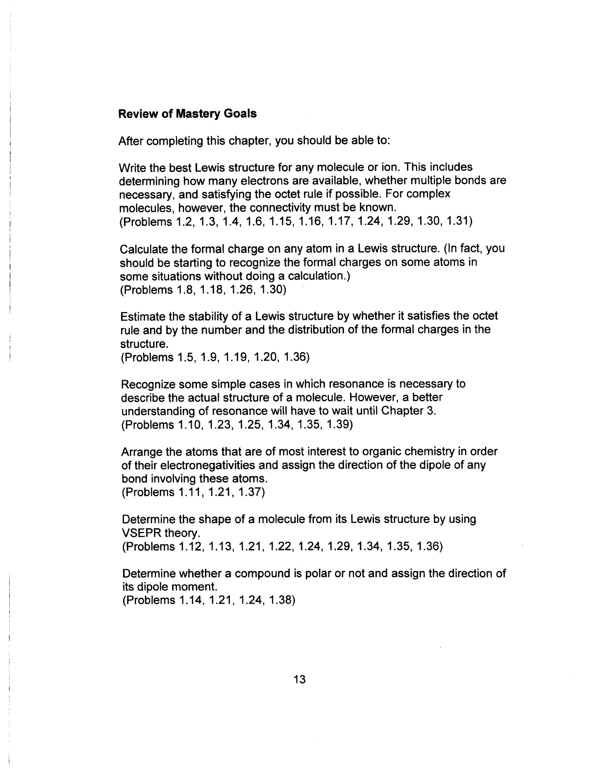 Review of Mastery Goals After completing this chapter, you should be able to: Write the best Lewis structure for any molecule or ion. This includes determining how many electrons are available, whether multiple bonds are necessary, and satisfying the octet rule if possible. For complex molecules, however, the connectivity must be known. (Problems 1.2, 1.3, 1.4, 1.6, 1.15, 1.16, 1.17, 1.24, 1.29, 1.30, 1.31) Calculate the formal charge on any atom in a Lewis structure. (In fact, you should be starting to recognize the formal charges on some atoms in some situations without doing a calculation.) (Problems 1.8, 1.18, 1.26, 1.30) Estimate the stability of a Lewis structure by whether it satisfies the octet rule and by the number and the distribution of the formal charges in the structure. (Problems 1.5, 1.9, 1.19, 1.20, 1.36) Recognize some simple cases in which resonance is necessary to describe the actual structure of a molecule. However, a better understanding of resonance will have to wait until Chapter 3. (Problems 1.10, 1.23, 1.25, 1.34, 1.35, 1.39) Arrange the atoms that are of most interest to organic chemistry in order of their electronegativities and assign the direction of the dipole of any bond involving these atoms. (Problems 1.11, 1.21, 1.37) Determine the shape of a molecule from its Lewis structure by using VSEPR theory. (Problems 1.12, 1.13, 1.21, 1.22, 1.24, 1.29, 1.34, 1.35, 1.36) Determine whether a compound is polar or not and assign the direction of its dipole moment. (Problems 1.14, 1.21, 1.24, 1.38) 13