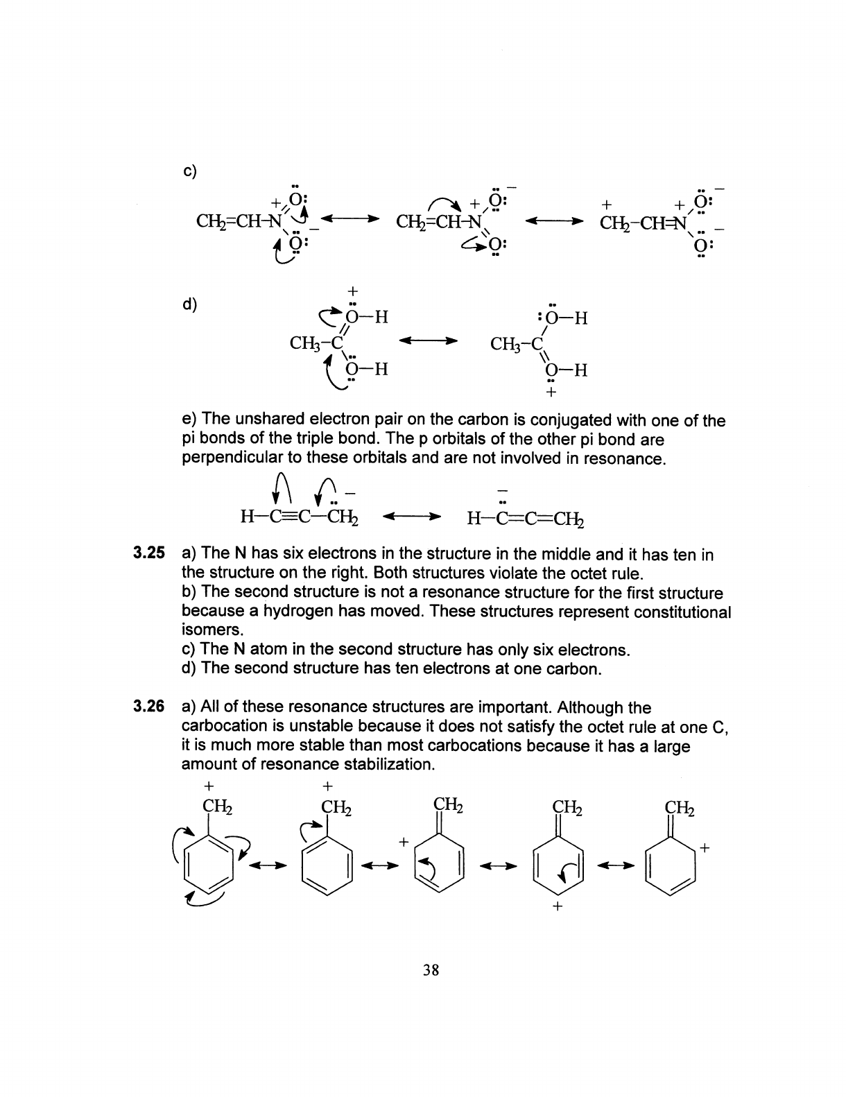 c) + + CH₂=CH-N CH₂=CH-N O: + d) CH₃-C CH₃-C + e) The unshared electron pair on the carbon is conjugated with one of the pi bonds of the triple bond. The p orbitals of the other pi bond are perpendicular to these orbitals and are not involved in resonance. H-C=C=CH₂ 3.25 a) The N has six electrons in the structure in the middle and it has ten in the structure on the right. Both structures violate the octet rule. b) The second structure is not a resonance structure for the first structure because a hydrogen has moved. These structures represent constitutional isomers. c) The N atom in the second structure has only six electrons. d) The second structure has ten electrons at one carbon. 3.26 a) All of these resonance structures are important. Although the carbocation is unstable because it does not satisfy the octet rule at one C, it is much more stable than most carbocations because it has a large amount of resonance stabilization. + + CH₂ CH₂ CH₂ CH₂ CH₂ + + + 38