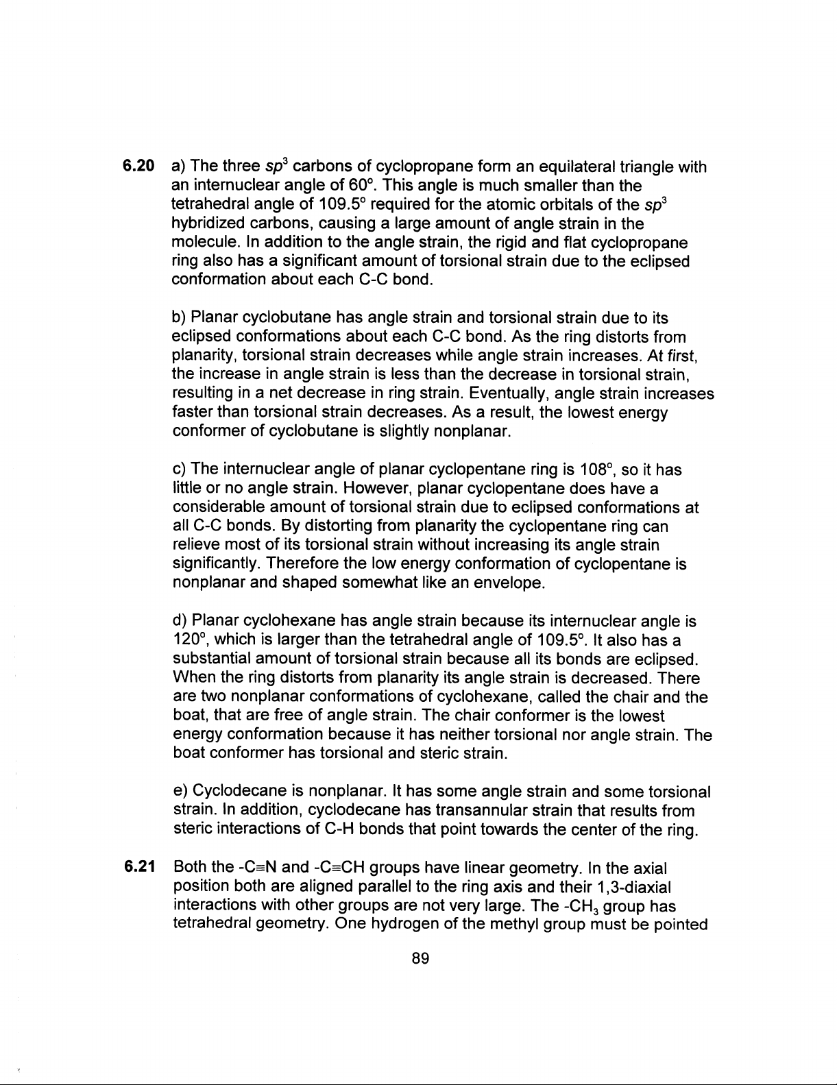 6.20 a) The three sp³ carbons of cyclopropane form an equilateral triangle with an internuclear angle of 60°. This angle is much smaller than the tetrahedral angle of 109.5° required for the atomic orbitals of the sp³ hybridized carbons, causing a large amount of angle strain in the molecule. In addition to the angle strain, the rigid and flat cyclopropane ring also has a significant amount of torsional strain due to the eclipsed conformation about each C-C bond. b) Planar cyclobutane has angle strain and torsional strain due to its eclipsed conformations about each C-C bond. As the ring distorts from planarity, torsional strain decreases while angle strain increases. At first, the increase in angle strain is less than the decrease in torsional strain, resulting in a net decrease in ring strain. Eventually, angle strain increases faster than torsional strain decreases. As a result, the lowest energy conformer of cyclobutane is slightly nonplanar. c) The internuclear angle of planar cyclopentane ring is 108°, so it has little or no angle strain. However, planar cyclopentane does have a considerable amount of torsional strain due to eclipsed conformations at all C-C bonds. By distorting from planarity the cyclopentane ring can relieve most of its torsional strain without increasing its angle strain significantly. Therefore the low energy conformation of cyclopentane is nonplanar and shaped somewhat like an envelope. d) Planar cyclohexane has angle strain because its internuclear angle is 120°, which is larger than the tetrahedral angle of 109.5°. It also has a substantial amount of torsional strain because all its bonds are eclipsed. When the ring distorts from planarity its angle strain is decreased. There are two nonplanar conformations of cyclohexane, called the chair and the boat, that are free of angle strain. The chair conformer is the lowest energy conformation because it has neither torsional nor angle strain. The boat conformer has torsional and steric strain. e) Cyclodecane is nonplanar. It has some angle strain and some torsional strain. In addition, cyclodecane has transannular strain that results from steric interactions of C-H bonds that point towards the center of the ring. 6.21 Both the -C=N and -C=CH groups have linear geometry. In the axial position both are aligned parallel to the ring axis and their 1,3-diaxial interactions with other groups are not very large. The -CH₃ group has tetrahedral geometry. One hydrogen of the methyl group must be pointed 89
