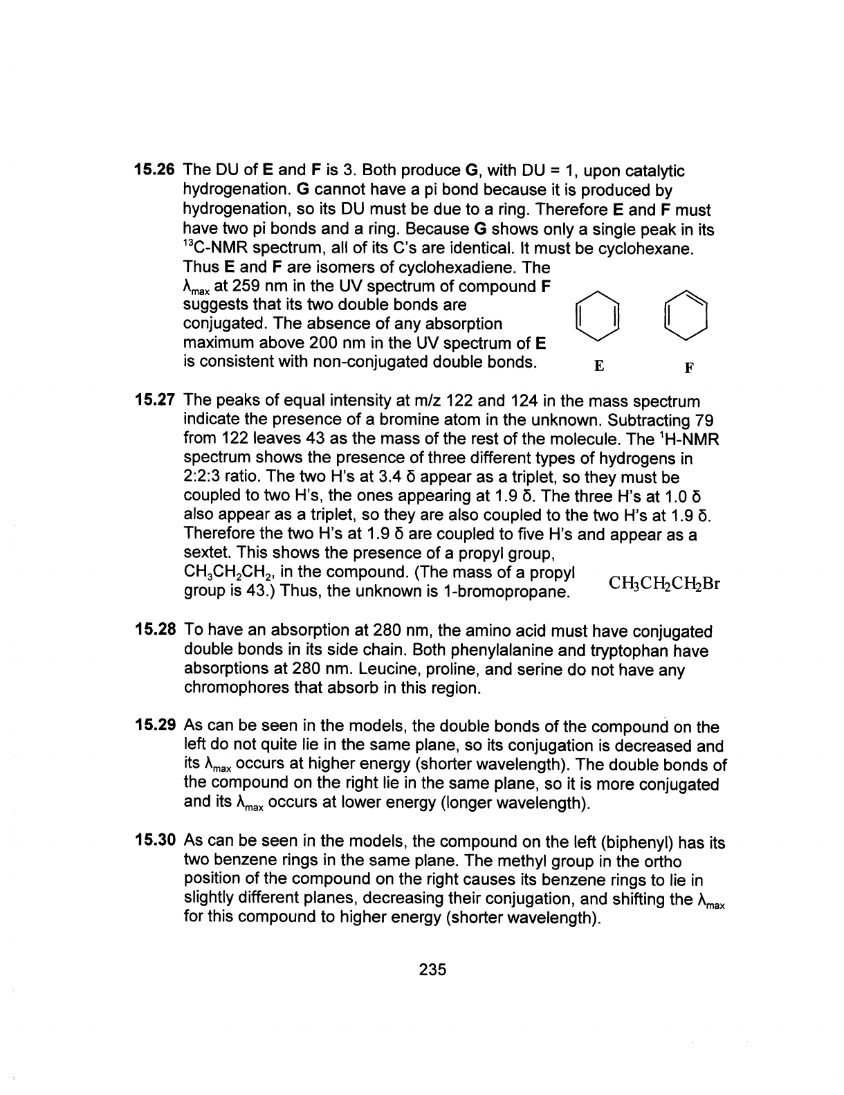 15.26 The DU of E and F is 3. Both produce G, with DU = 1, upon catalytic hydrogenation. G cannot have a pi bond because it is produced by hydrogenation, so its DU must be due to a ring. Therefore E and F must have two pi bonds and a ring. Because G shows only a single peak in its spectrum, all of its C's are identical. It must be cyclohexane. Thus E and F are isomers of cyclohexadiene. The at 259 nm in the UV spectrum of compound F suggests that its two double bonds are conjugated. The absence of any absorption maximum above 200 nm in the UV spectrum of E is consistent with non-conjugated double bonds. E F 15.27 The peaks of equal intensity at m/z 122 and 124 in the mass spectrum indicate the presence of a bromine atom in the unknown. Subtracting 79 from 122 leaves 43 as the mass of the rest of the molecule. The spectrum shows the presence of three different types of hydrogens in 2:2:3 ratio. The two H's at 3.4 δ appear as a triplet, so they must be coupled to two H's, the ones appearing at 1.9 δ. The three H's at 1.0 δ also appear as a triplet, so they are also coupled to the two H's at 1.9 δ. Therefore the two H's at 1.9 δ are coupled to five H's and appear as a sextet. This shows the presence of a propyl group, CH₃CH₂CH₂, in the compound. (The mass of a propyl group is 43.) Thus, the unknown is 1-bromopropane. CH₃CH₂CH₂Br 15.28 To have an absorption at 280 nm, the amino acid must have conjugated double bonds in its side chain. Both phenylalanine and tryptophan have absorptions at 280 nm. Leucine, proline, and serine do not have any chromophores that absorb in this region. 15.29 As can be seen in the models, the double bonds of the compound on the left do not quite lie in the same plane, so its conjugation is decreased and its occurs at higher energy (shorter wavelength). The double bonds of the compound on the right lie in the same plane, so it is more conjugated and its occurs at lower energy (longer wavelength). 15.30 As can be seen in the models, the compound on the left (biphenyl) has its two benzene rings in the same plane. The methyl group in the ortho position of the compound on the right causes its benzene rings to lie in slightly different planes, decreasing their conjugation, and shifting the for this compound to higher energy (shorter wavelength). 235