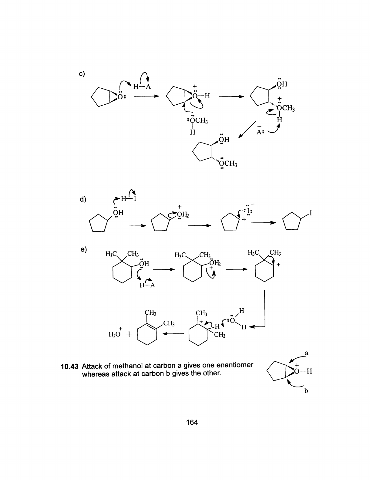 c) H-A + OH O: H + OCH₃ H H A: OH OCH₃ d) + OH : I: OH₂ I + e) CH₃ H₃C CH₃ CH₃ : OH OH₂ + + H-A CH₃ CH₃ H CH₃ + H H H₃O + + CH₃ a 10.43 Attack of methanol at carbon a gives one enantiomer + whereas attack at carbon b gives the other. b 164