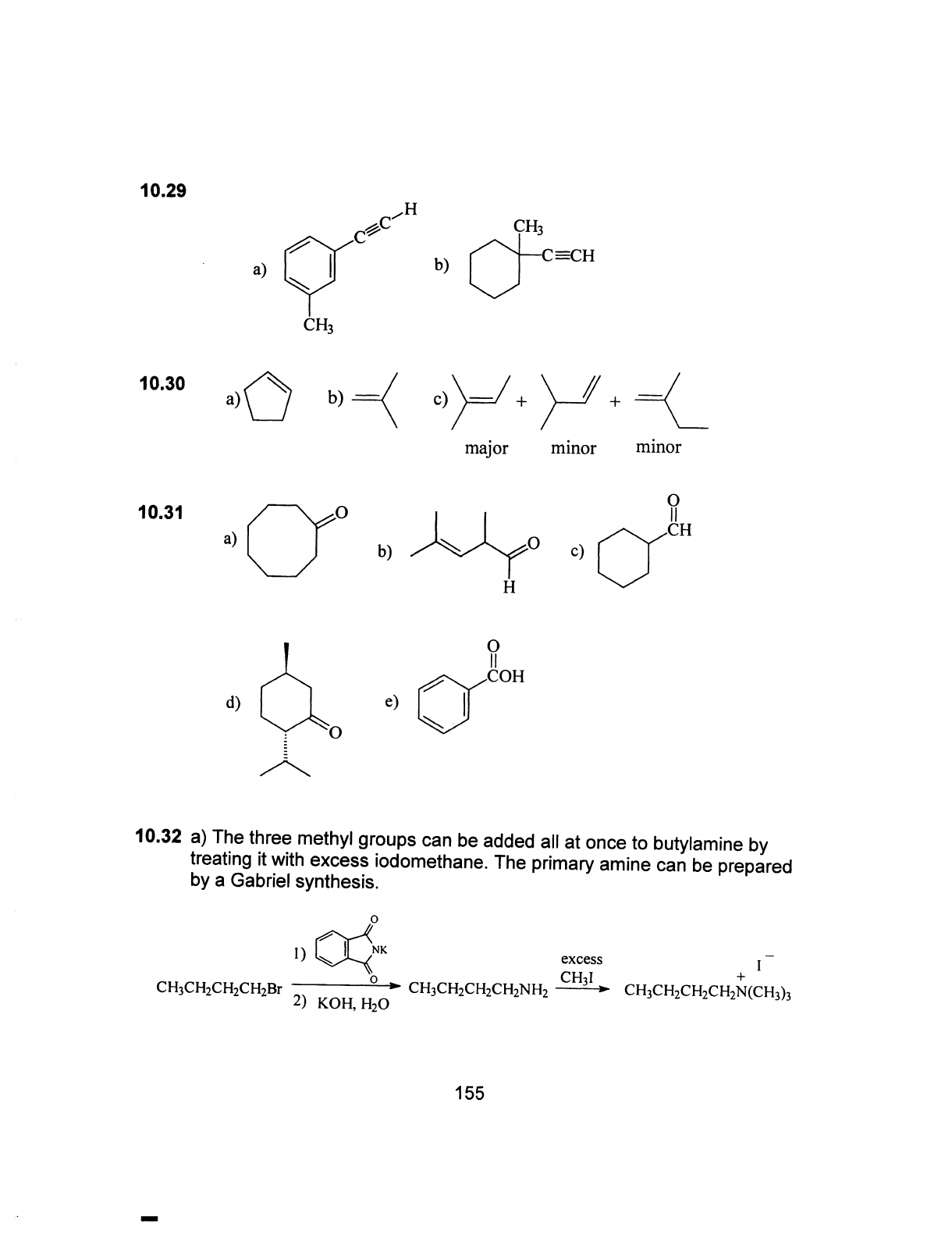 10.29 H CH₃ C=CH a) b) CH₃ 10.30 a) b) c) + + major minor minor O 10.31 CH a) b) c) H O COH d) e) O 10.32 a) The three methyl groups can be added all at once to butylamine by treating it with excess iodomethane. The primary amine can be prepared by a Gabriel synthesis. o 1) NK excess I CH₃I + CH₃CH₂CH₂CH₂Br CH₃CH₂CH₂CH₂NH₂ CH₃CH₂CH₂CH₂N(CH₃)₃ 2) KOH, H₂O 155