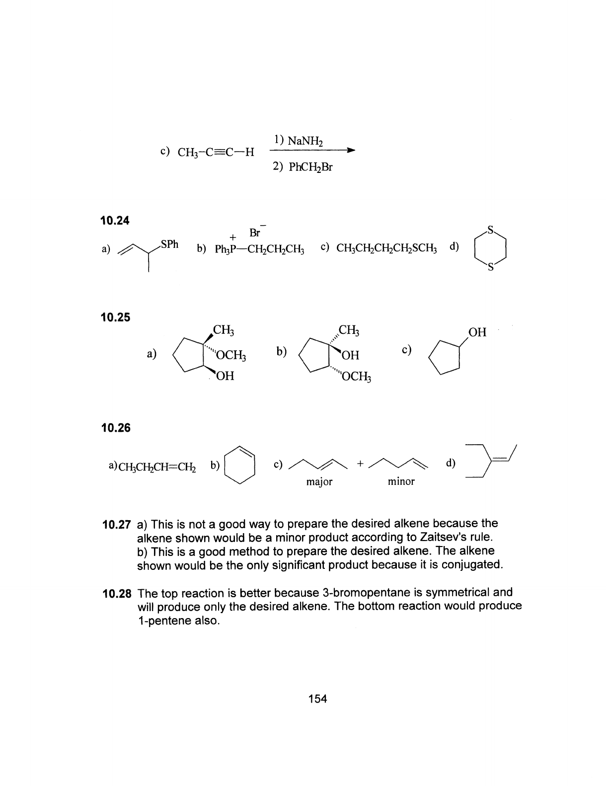 1) NaNH₂ c) CH₃-C=C-H 2) PhCH₂Br 10.24 Br⁻ S + a) SPh b) c) CH₃CH₂CH₂CH₂SCH₃ d) S 10.25 CH₃ CH₃ OH a) OCH₃ b) OH c) OH 10.26 a)CH₃CH₂CH=CH₂ b) c) + d) major minor 10.27 a) This is not a good way to prepare the desired alkene because the alkene shown would be a minor product according to Zaitsev's rule. b) This is a good method to prepare the desired alkene. The alkene shown would be the only significant product because it is conjugated. 10.28 The top reaction is better because 3-bromopentane is symmetrical and will produce only the desired alkene. The bottom reaction would produce 1-pentene also. 154