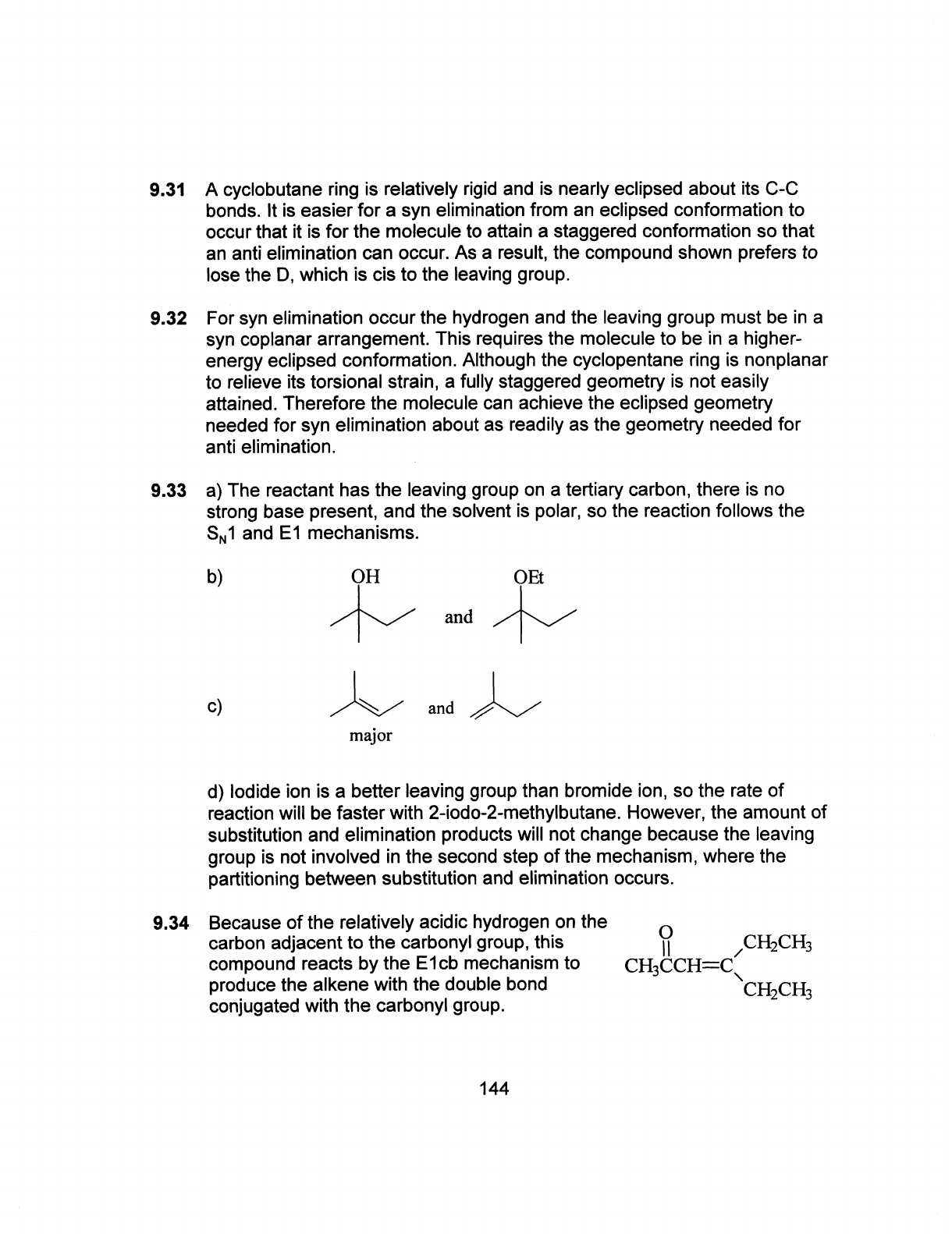 9.31 A cyclobutane ring is relatively rigid and is nearly eclipsed about its C-C bonds. It is easier for a syn elimination from an eclipsed conformation to occur that it is for the molecule to attain a staggered conformation so that an anti elimination can occur. As a result, the compound shown prefers to lose the D, which is cis to the leaving group. 9.32 For syn elimination occur the hydrogen and the leaving group must be in a syn coplanar arrangement. This requires the molecule to be in a higher- energy eclipsed conformation. Although the cyclopentane ring is nonplanar to relieve its torsional strain, a fully staggered geometry is not easily attained. Therefore the molecule can achieve the eclipsed geometry needed for syn elimination about as readily as the geometry needed for anti elimination. 9.33 a) The reactant has the leaving group on a tertiary carbon, there is no strong base present, and the solvent is polar, so the reaction follows the SN1 and E1 mechanisms. b) OH OEt and c) and major d) lodide ion is a better leaving group than bromide ion, so the rate of reaction will be faster with 2-iodo-2-methylbutane. However, the amount of substitution and elimination products will not change because the leaving group is not involved in the second step of the mechanism, where the partitioning between substitution and elimination occurs. 9.34 Because of the relatively acidic hydrogen on the carbon adjacent to the carbonyl group, this CH₂CH₃ compound reacts by the E1cb mechanism to produce the alkene with the double bond CH₂CH₃ conjugated with the carbonyl group. 144