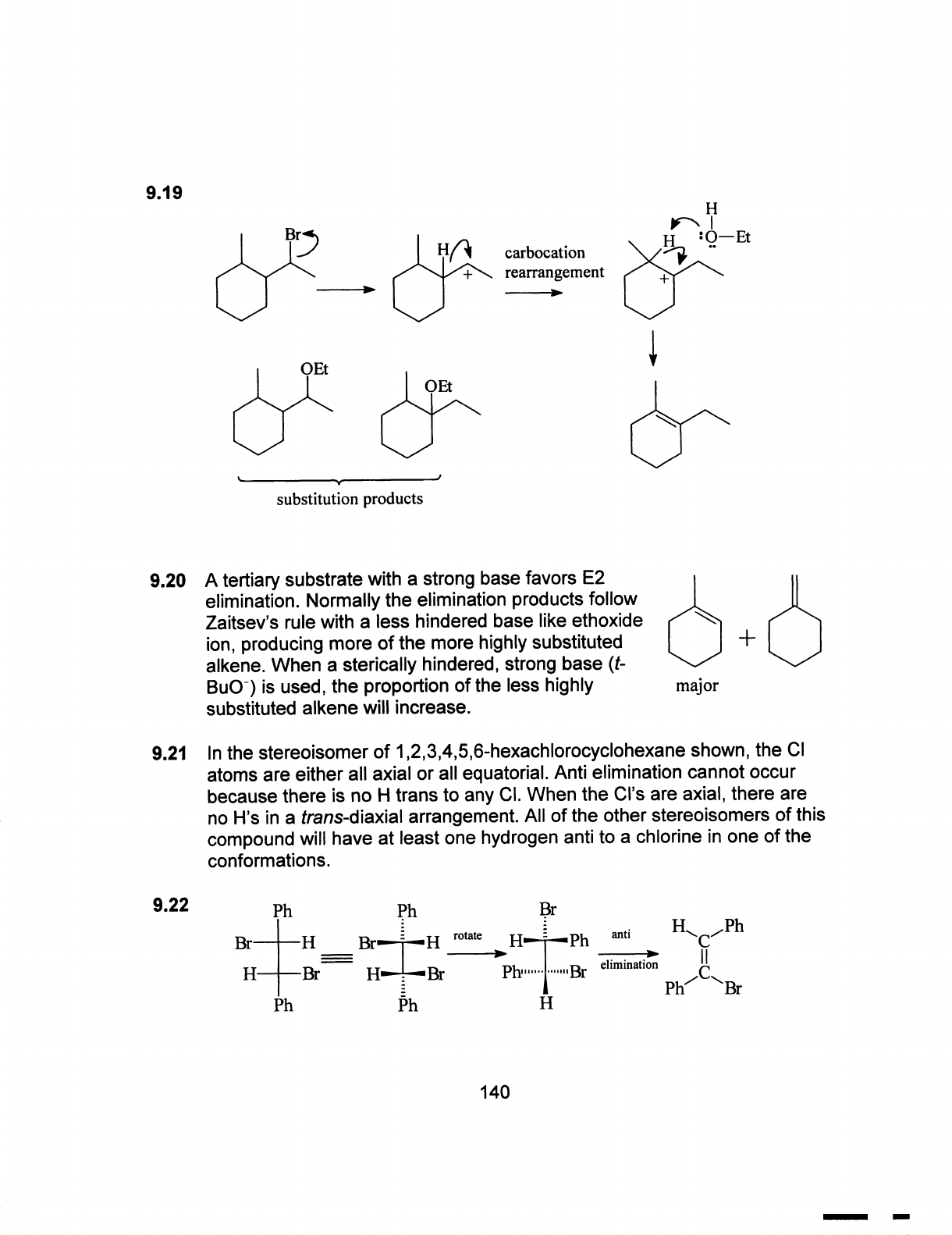 9.19 H Br H Et H carbocation + rearrangement + OEt OEt substitution products 9.20 A tertiary substrate with a strong base favors E2 elimination. Normally the elimination products follow Zaitsev's rule with a less hindered base like ethoxide ion, producing more of the more highly substituted + alkene. When a sterically hindered, strong base (t- BuO⁻) is used, the proportion of the less highly major substituted alkene will increase. 9.21 In the stereoisomer of ,3,4,5,6-hexachlorocyclohexane shown, the CI atoms are either all axial or all equatorial. Anti elimination cannot occur because there is no H trans to any CI. When the Cl's are axial, there are no H's in a trans-diaxial arrangement. All of the other stereoisomers of this compound will have at least one hydrogen anti to a chlorine in one of the conformations. 9.22 Ph Ph Br H Ph H H rotate Br H Ph anti Br C H Br H Br Ph Br elimination C Ph Br Ph Ph H 140