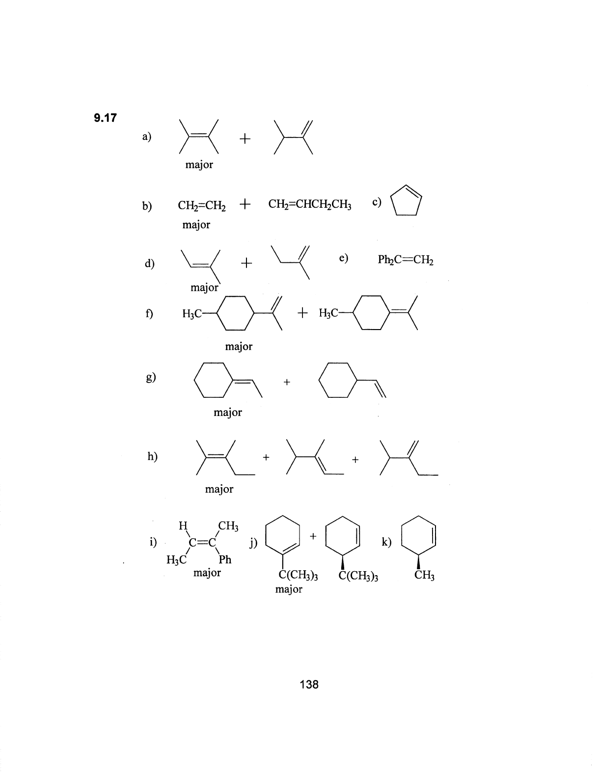 9.17 a) + major b) CH₂=CH₂ + c) major d) + e) Ph₂C=CH₂ major f) H₃C + H₃C major g) + major h) + + major H CH₃ + i) C=C j) k) H₃C Ph major C(CH₃)₃ C(CH₃)₃ CH₃ major 138