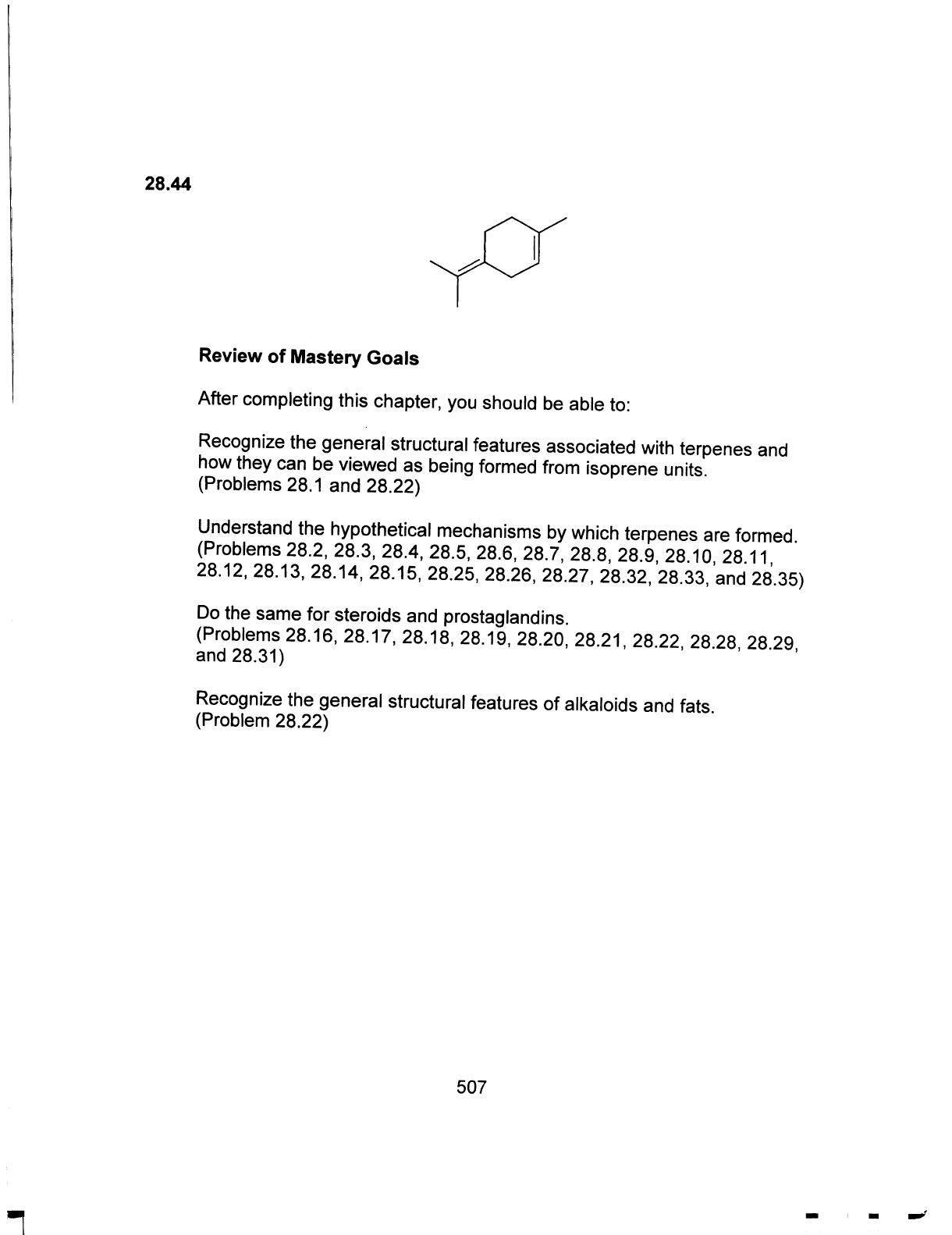 28.44 Review of Mastery Goals After completing this chapter, you should be able to: Recognize the general structural features associated with terpenes and how they can be viewed as being formed from isoprene units. (Problems 28.1 and 28.22) Understand the hypothetical mechanisms by which terpenes are formed. (Problems 28.2, 28.3, 28.4, 28.5, 28.6, 28.7, 28.8, 28.9, 28.10, 28.11, 28.12, 28.13, 28.14, 28.15, 28.25, 28.26, 28.27, 28.32, 28.33, and 28.35) Do the same for steroids and prostaglandins. (Problems 28.16, 28.17, 28.18, 28.19, 28.20, 28.21, 28.22, 28.28, 28.29, and 28.31) Recognize the general structural features of alkaloids and fats. (Problem 28.22) 507