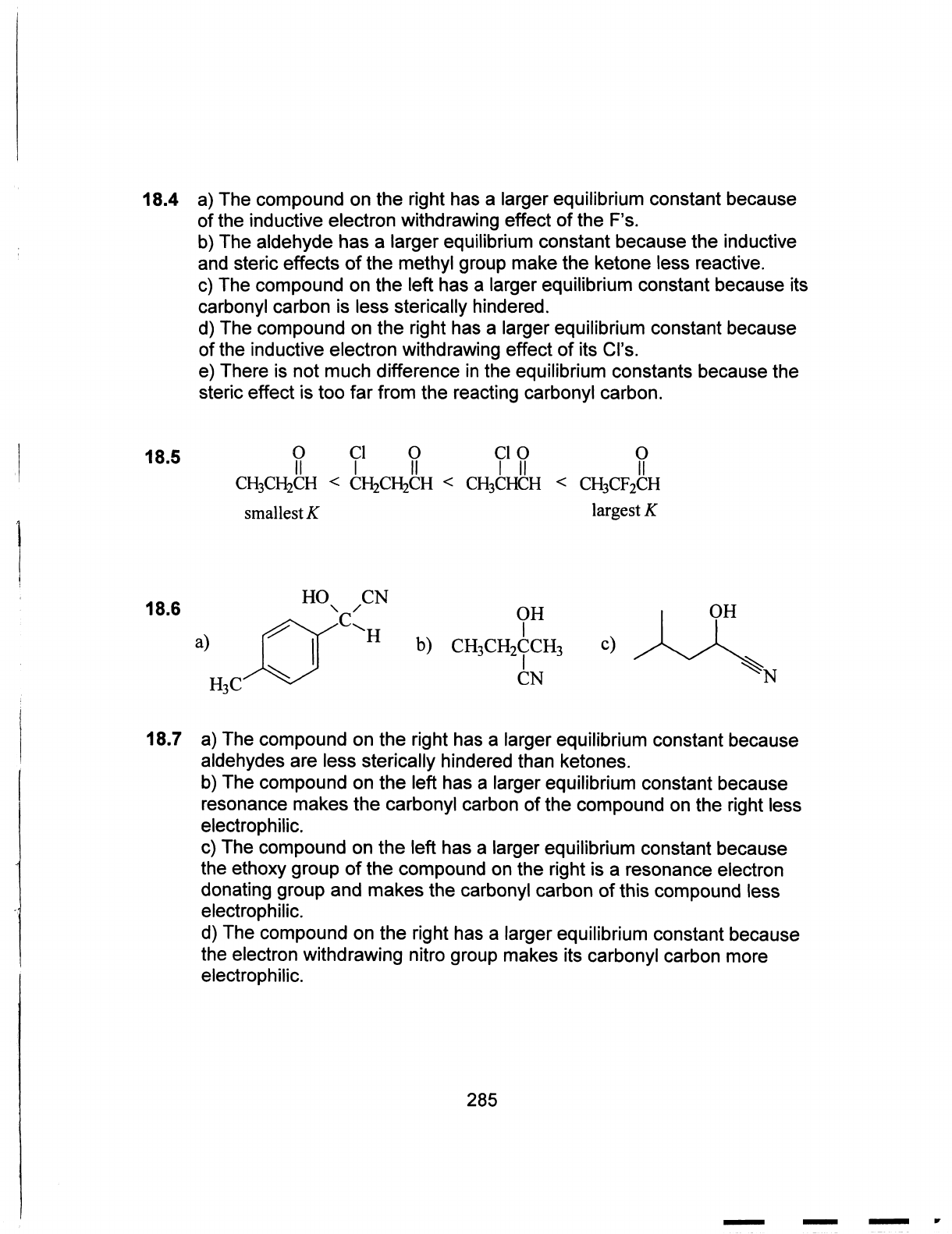 18.4 a) The compound on the right has a larger equilibrium constant because of the inductive electron withdrawing effect of the F's. b) The aldehyde has a larger equilibrium constant because the inductive and steric effects of the methyl group make the ketone less reactive. c) The compound on the left has a larger equilibrium constant because its carbonyl carbon is less sterically hindered. d) The compound on the right has a larger equilibrium constant because of the inductive electron withdrawing effect of its Cl's. e) There is not much difference in the equilibrium constants because the steric effect is too far from the reacting carbonyl carbon. 18.5 CH₃CH₂CH