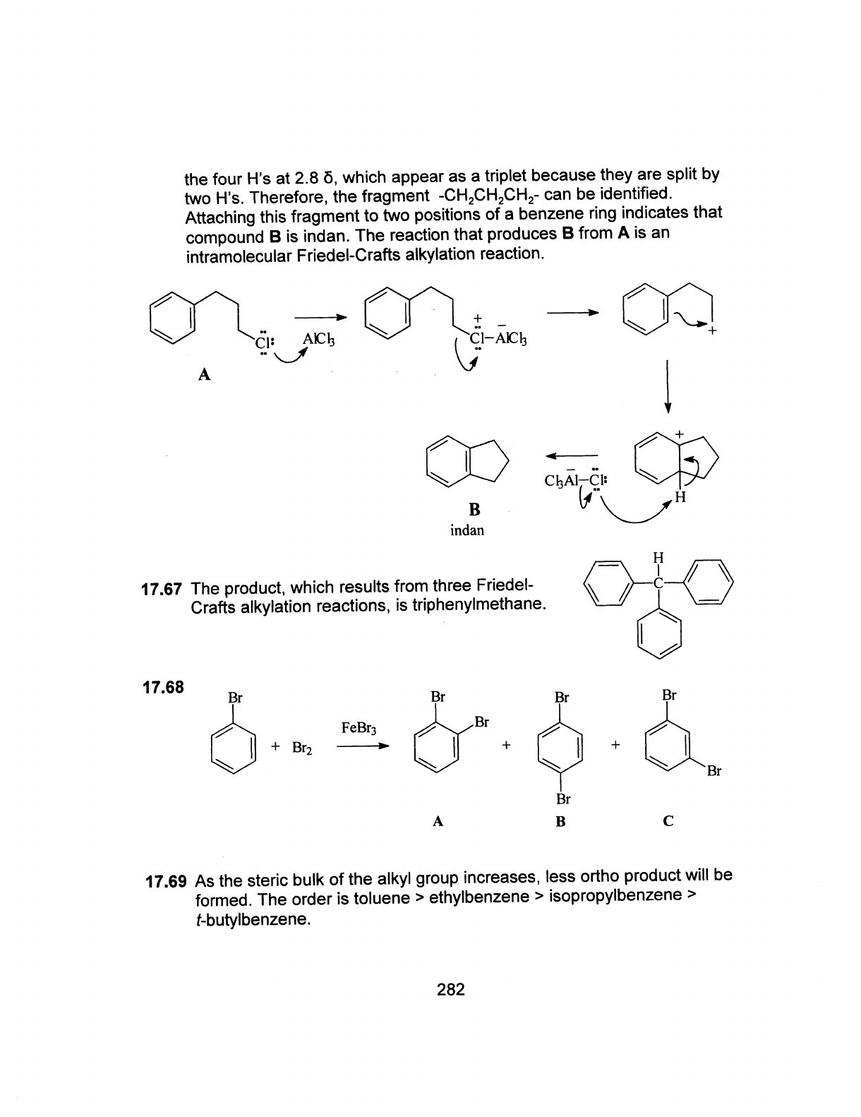 the four H's at 2.8 δ, which appear as a triplet because they are split by two H's. Therefore, the fragment can be identified. Attaching this fragment to two positions of a benzene ring indicates that compound B is indan. The reaction that produces B from A is an intramolecular Friedel-Crafts alkylation reaction. + + Cl: A + H B indan H 17.67 The product, which results from three Friedel- C Crafts alkylation reactions, is triphenylmethane. 17.68 Br Br Br Br FeBr₃ Br + Br₂ + + Br Br A B C 17.69 As the steric bulk of the alkyl group increases, less ortho product will be formed. The order is toluene > ethylbenzene > isopropylbenzene > 282