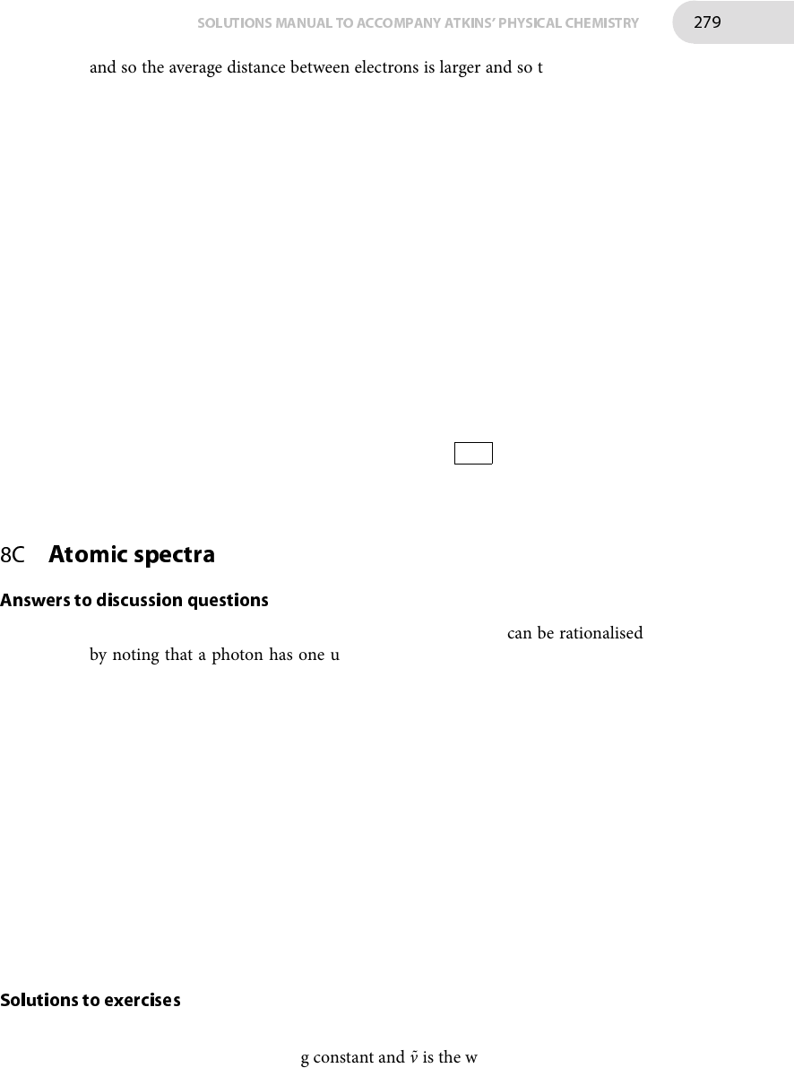 SOLUTIONSMANUAL TO ACCOMPANY ATKINS' PHYSICAL CHEMISTRY 279 and so the average distance between electrons is larger and so the average re- pulsion between electrons is much smaller. [Kr] 4d15s2 is therefore the lower energy, more stable con�guration. �eAg atomhas the con�guration [Kr] 4d105s1, as opposed to [Kr] 4d95s2.�e number of both spin up and spin down electrons is the same in both of these con�gurations, but the number of parallel spin pairs within the 4d subshell is larger for the con�guration [Kr] 4d105s1, which means this con�guration is lower in energy, as a parallel spin pair is lowest in energy when between two electrons within the same subshell. Also this has fewer electrons in higher energy subshells. P8B.4 �e electronic con�guration of Fe is [Ar] 3d64s2, of Fe2+ it is [Ar] 3d6, and of Fe3+ it is [Ar] 3d5. Hence, the outermost electron in both ions is in a 3d orbital, with the only di�erence between these con�gurations that Fe2+ has one of the �ve 3d orbitals doubly occupied. �ere is more repulsion between the 6 3d electrons in Fe2+ than the 5 3d elec- trons in Fe3+, and there is no compensating increase in the atomic number to draw the electrons towards the nucleus, and so the Fe2+ ion is expected to be the larger of the two ions. 8C Atomic spectra Answers to discussion questions D8C.2 �e selection rules are given in [8C.8–335]. In part these can be rationalised by noting that a photon has one unit of (spin) angular momentum and that in the spectroscopic transition this angular momentum must be conserved. �e selection rule for l , ∆l = ±1, can be understood as a single electron in the atom changing angular momentum by one unit in order to accommodate the angular momentum from the photon. �is selection is derived in How is that done? 8C.1 on page 327 by considering the relevant transition dipole moment.�e selection rule for the total spin, ∆S = 0, stems from the fact that the electromagnetic radiation does not a�ect the spin directly. �e selection rules for multi-electron atoms are harder to rationalise not least because the change in the overall angular momentum (L and J) is a�ected both by changes in the angular momenta of individual electrons and by the way in which these couple together. D8C.4 �is is discussed in Section 8C.2(b) on page 329. Solutions to exercises E8C.1(b) �e spectral lines of a hydrogen atom are given by [8A.1–304], ν̃ = R̃H(n−21 − n−22 ), where R̃H is the Rydberg constant and ν̃ is the wavenumber of the tran- sition.