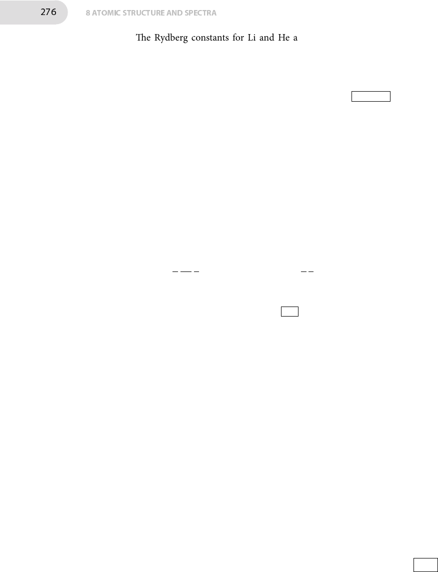 276 8 ATOMIC STRUCTURE AND SPECTRA �e Rydberg constants for Li and He are in principle di�erent because the reduced masses of the atoms are di�erent. However, this di�erence is too small to have a signi�cant e�ect on the result of the present calculation, given the precision of the data.�erefore, it is assumed that R̃Li/R̃He = 1 and hence ILi = IHe(3/2)2 = (54.36 eV) × (3/2)2 = 122.3 eV P8A.6 From [8A.21–314], the wavefunctions for the px and py orbitals can be written asψpx = r f (r) sin θ cos ϕ andψpy = r f (r) sin θ sin ϕ.�en, using the identities cos x = (eix + e−ix)/2 and sin x = (eix − e−ix)/2i, these wavefunctions can be rewritten ψpx = (2)−1r f (r) sin θ(eiϕ + e−iϕ) ψpy = (2i)−1r f (r) sin θ(eiϕ − e−iϕ) �e form of the operator l̂z is given in [7F.5b–284], l̂z = (ħ/i)∂/∂ϕ. To deter- mine whether or not ψpx is an eigenfunction of l̂z , the operator is allowed to act on the function ħ i ∂ ∂ϕ 1 2 r f (r) sin θ(eiϕ + e−iϕ) = ħ i 1 2 r f (r) sin θ(ieiϕ − ie−iϕ) It is evident that the e�ect of the operator is not to regenerate the original function times a constant, so ψpx is not an eigenfunction of the operator. A similar calculation shows that the same is true for ψpy . However, the functions e±iϕ are eigenfunctions of l̂z , (ħ/i)∂/∂ϕ e±iϕ = ±ħe±iϕ . Using the identities e±ix = cos x ± i sin x, suitable combinations of ψpx and ψpy are found which are proportional to e±iϕ , and hence which are eigenfunctions of l̂z .�ere are two such combinations ψpx ± i × ψpy = r f (r) sin θ cos ϕ + i × r f (r) sin θ sin ϕ = r f (r) sin θ e±iϕ P8A.8 �e expectation value of 1/r is given by ⟨1/r⟩ = ∫ ψ∗r−1ψ dτ.�ewavefunction can bewritten as a product of a radial part and an angular partψ = R(r)Y(θ , ϕ). As 1/r is a function of r only, the integral over the angles can be evaluated separately, and because the Y(θ , ϕ) are normalized with respect to integra- tion over the angles the integral simpli�es to ⟨1/r⟩ = ∫ ∞ 0 R(r)2(1/r)r2 dr = ∫ ∞ 0 R(r)2r dr. (a) For a 1s orbital the radial function is R1,0(r) = 2(Z/a0)3/2e−Zr/a0 (Ta- ble 8A.1) and so ⟨r−1⟩ = 4(Z/a0)3 ∫ ∞ 0 re−2Zr/a0dr = 4(Z/a)3[1!/(2Z/a0)2] = Z/a0 where the integral is evaluated using Integral E.3 with n = 1 and k = 2Z/a0.
