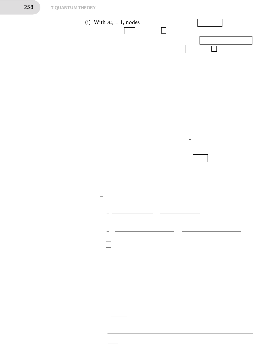 258 7 QUANTUM THEORY (i) With m l = 1, nodes in the real part occur at π/2, 3π/2 , and in the imag- inary part at 0, π .�ere are 2 nodes in each of the parts. (ii) With m l = 2, nodes in the real part occur at π/4, 3π/4, 5π/4, 7π/4 , and in the imaginary part at 0, π/2, π, 3π/2 .�ere are 4 nodes in each of the parts. E7F.3(b) �e normalization condition is ∫ ψ∗m lψm l dτ = 1. In this case the integral is over ϕ in the range 0 ≤ ϕ ≤ 2π, and the wavefunction is ψm l = N cosm lϕ, hence N2 ∫ ψ∗m lψm l dτ = N2 ∫ 2π 0 cos2(m lϕ)dϕ �e integral is evaluated by using the identity cos2 θ+sin2 θ = 1, hence cos2 θ = 1 − sin2 θ, and then using Intergral T.2 with a = 2π and k = m l N2 ∫ 2π 0 [1 − sin2(m lϕ)]dϕ = N2 ∫ 2π 0 dϕ − N2 ∫ 2π 0 sin2(m lϕ)dϕ = 2πN2 − N2 [ 12 × 2π − (1/4m l) sin(2πm l)] Because sin(2πm l) = 0 for integer m l it follows that the integral evaluates to πN2 and hence the normalization factor is N = π−1/2 . E7F.4(b) �e integral to evaluate is ∫ 2π 0 cos(m lϕ) cos(m′ lϕ)dϕ. Using the identity given in the question, the integral can be rewritten as 1 2 ∫ 2π 0 cos[(m l +m′ l)ϕ] + cos[(m l −m ′ l)ϕ]dϕ = 1 2 sin[(m l +m′ l)ϕ] m l +m′ l + sin[(m l −m′ l)ϕ] m l −m′ l ∣ 2π 0 = 1 2 ( sin[2π(m l +m′ l)] − sin 0 m l +m′ l + sin[2π(m l −m′ l)] − sin 0 m l −m′ l ) = 0 Hence these two wavefunctions are orthogonal. E7F.5(b) �e energy levels on a particle on a ring are [7F.4–283], Em l = m2l ħ 2/2I where I is the momentum of inertia of the system, I = mr2, see�e chemist’s toolkit 20 in Topic 7F on page 282. �is is equal to the classical average energy when 1 2 kT = m2l ħ 2/2I. Here kT = (1.3806×10−23 JK−1)×(298 K) = 4.11...×10−21J. Solving this for ∣m l ∣ gives ∣m l ∣ = ( kTmr 2 ħ2 ) 1/2 = [(1.6726 × 10−27 kg) × (100 × 10−12 m)2(4.11... × 10−21J)]1/2 1.0546 × 10−34 J s = 2.49 As m l must be integral the closest level is ∣m l ∣ = 2.