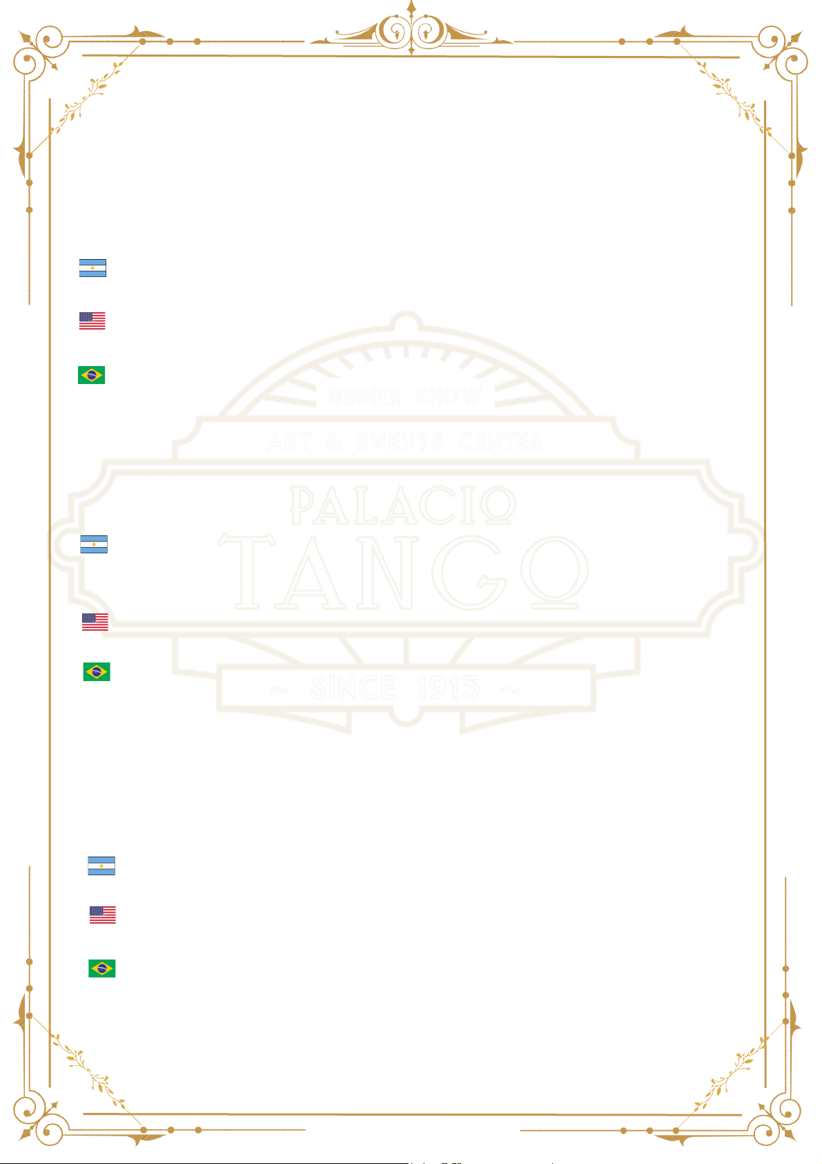 “revirada” - ensalada / salad / salada |Trozos de pol lo gr i l lado, hojas verdes, croutones de pan saborizados, panceta crocante, escamas de parmesano y aderezo Caesar. |Cubes of gr i l led chicken, green leaves, brad croutons, cr ispy bacon, parmesan str ips and Caesar dressing. |Pedaços de frango grelhado,folhas verdes, croutones de pães saborizados, bacon crocante, lascas de parmesão y molho Caesar “BUENOS AIRES HORA CERO” - Empanadas / turnovers / pasteis |Empanada criol la de carne de nalga cortada a cuchi l lo , y empanada de jamón cocido y queso mozzarel la. |Argentine creole knife cut meat, and ham and mozzarel la cheese turnovers |Empanada criol la de carne, cortadas a faca, e empanada de presunto e quei jo mozzarel la “chiquilín de bachin” - sopa / soup / sopa |Sopa de calabaza ahumada y jengibre con láminas de parmesano ital iano y ciboulette |Smoked pumpkin and ginger soup with sl ices of i tal ian parmesan, and chives. |Sopa de abóbora e gengibre defumada com fatias de parmesão ital iano e cebol inha ENTRADAS - STARTERS - ENTRADRAS “ADIÓS NONINO” - BIFE DE CHORIZO -STEAK - CONTRAFILÉ |Bife de chorizo raza Angus acompañado de papas rúst icas, con degustación de salsas clásicas argentinas de chimichurry y cr iol la. |Angus steak with rust ic potatoes, accompained by two classic argentine sauces |Contraf i lé Angus, acompanhado de batatas rust icas, com degustação dos classicos molhos argentinos de chimichurry e cr iol la “LO QUE VENDRÁ” - CRÊPES |Crêpes rel lenas de r icotta y espinaca acompañadas de salsas f i letto y bechamel |Ricotta and spinach stuffed crêpes served with f i letto and béchamel sauces |Crepes recheados com ricota e espinafre servidos com molhos de fi lé e bechamel “balada para un loco” - pollo / chicken / frango |Pamplona de pol lo y lamina de panceta crocante rel lena de frutos secos, queso mar del plata, verduras salteadas, sou ff le de polenta y calabaza anco en suave salsa de puerros. |Chicken Pamplona with thin sl ice of cr ispy bacon, f i l led with assorted nuts, tradit ional mar del plata cheese, gr i l l vegetables, polenta and anco pumpkin sou ff le in soft leeks sauce. |Medalhões de frango com bacon, crocante de frutos secos, quei jo de mar del plata, legumes salteados, sou ff le de polenta e abobora com suave molho de alho poro. PLATOS PRINCIPALES MAIN COURSES -PRATOS PRINCIPAIS PLATOS PRINCIPALES MAIN COURSES -PRATOS PRINCIPAIS “ESCUALO” - PESCADO / FISH / PEIXE |Pesca de mar acompañada de verduras gri l ladas, papas bouchon y perfume de sésamo |Sea f ish with gri l l vegetables, bouchon potatoes and sesame perfum. |Peixe do mar com legumes grelhados, batatas bouchon con aromas de sesamo “amelitango” - vegano / vegan / vegetariano |Tabulé de quinoa, tomate y perej i l , sobre canasta de maíz , verduras gri l ladas, crocante de lentejas, cebol l i tas encurt idas y salsa de hinojo |Quinoa, tomato and parsley tabbouleh over corn basket , gr i l led vegetables, lent i l cr isp, pickled onions and fennel sauce |Tabule de quinoa, tomate e salsa sobre cesta de milho, legumes grelhados, lent i lha crocante, cebola em conserva e molho de erva-doce “PRIMAVERA PORTEÑA” - MILANESA |Milanesa de ternera acompañada con papas fr i tas |Veal Mi lanesa served with french fr ies |Milanesa de vitela servida com batatas fr i tas “la camorra” - pasta / massa |Spaghett i , pasta ital iana con manteca y parmesano |Spaghett i , I tal ian pasta with manteca y parmesan |Espaguete, massa ital iana com manteiga e quei jo parmesão MENÚ INFANTIL POSTRES - DESSERTS - SOBREMESAS “LIBERTANGO” - PANNA COTTA |Panna Cotta de chocolate blanco con corazón de maracuyá y frutos rojos patagónicos |White chocolate panna cotta with passion fruit heart and Patagonian red berr ies |Panna cotta de chocolate branco com coração de maracujá e frutas vermelhas da Patagônia “milonga del ángel” - parfait de mascarpone |Parfait de queso mascarpone acompañado de salsa de dulce de leche, chocolate crocante y frutos secos |Mascarpone cheese parfait with dulce de leche sauce, crunchy chocolate and dried fruits and nuts |Parfait de quei jo mascarpone com molho de doce de leite , chocolate crocante, frutas secas e nozes “vuelo al sur” - mousse |Mousse de chocolate en base de marquise con salsa de dulce de leche y crocante de caramelo |Chocolate mousse on a marquise base with dulce de leche sauce and caramel crunchy topping. |Mousse de chocolate sobre base de marquise com calda de doce de leite e cobertura crocante de caramelo