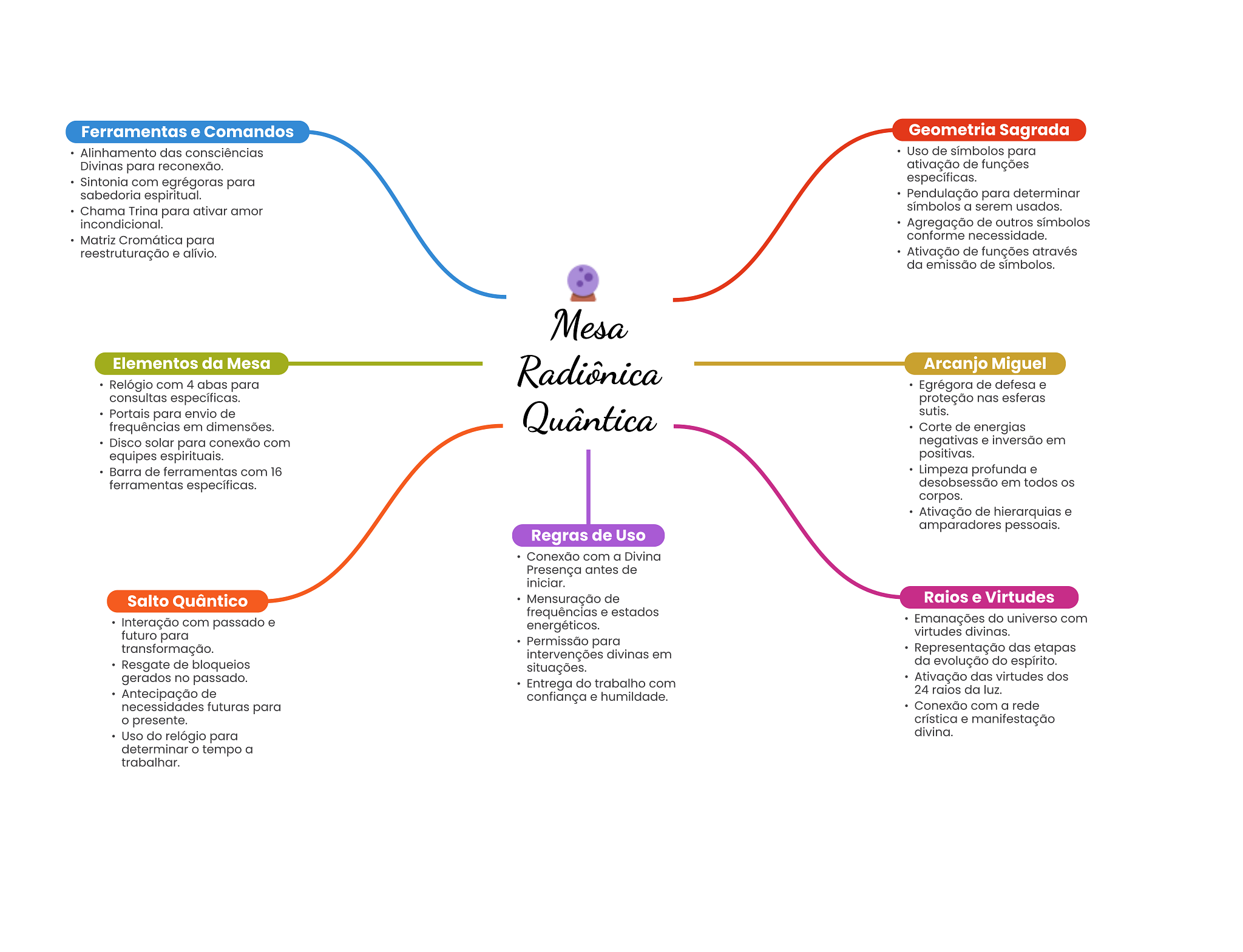 Ferramentas e Comandos Geometria Sagrada Alinhamento das consciências Uso de símbolos para Divinas para reconexão. ativação de funções Sintonia com egrégoras para específicas. sabedoria espiritual. Pendulação para determinar Chama Trina para ativar amor símbolos a serem usados. incondicional. Agregação de outros símbolos Matriz Cromática para conforme necessidade. reestruturação e alívio. Ativação de funções através da emissão de símbolos. Mesa Elementos da Mesa Radiônica Arcanjo Miguel Relógio com 4 abas para Egrégora de defesa e consultas específicas. proteção nas esferas Portais para envio de Quântica sutis. frequências em dimensões. Corte de energias Disco solar para conexão com negativas e inversão em equipes espirituais. positivas. Barra de ferramentas com 16 Limpeza profunda e ferramentas específicas. desobsessão em todos corpos. Ativação de hierarquias e amparadores pessoais. Regras de Uso Conexão com a Divina Presença antes de iniciar. Salto Quântico Mensuração de Raios e Virtudes frequências e estados Interação com passado e energéticos. Emanações do universo com futuro para virtudes divinas. Permissão para transformação. intervenções divinas em Representação das etapas Resgate de bloqueios situações. da evolução do espírito. gerados no passado. Entrega do trabalho com Ativação das virtudes dos Antecipação de 24 raios da luz. confiança e humildade. necessidades futuras para Conexão com a rede presente. crística e manifestação Uso do relógio para divina. determinar tempo a trabalhar.