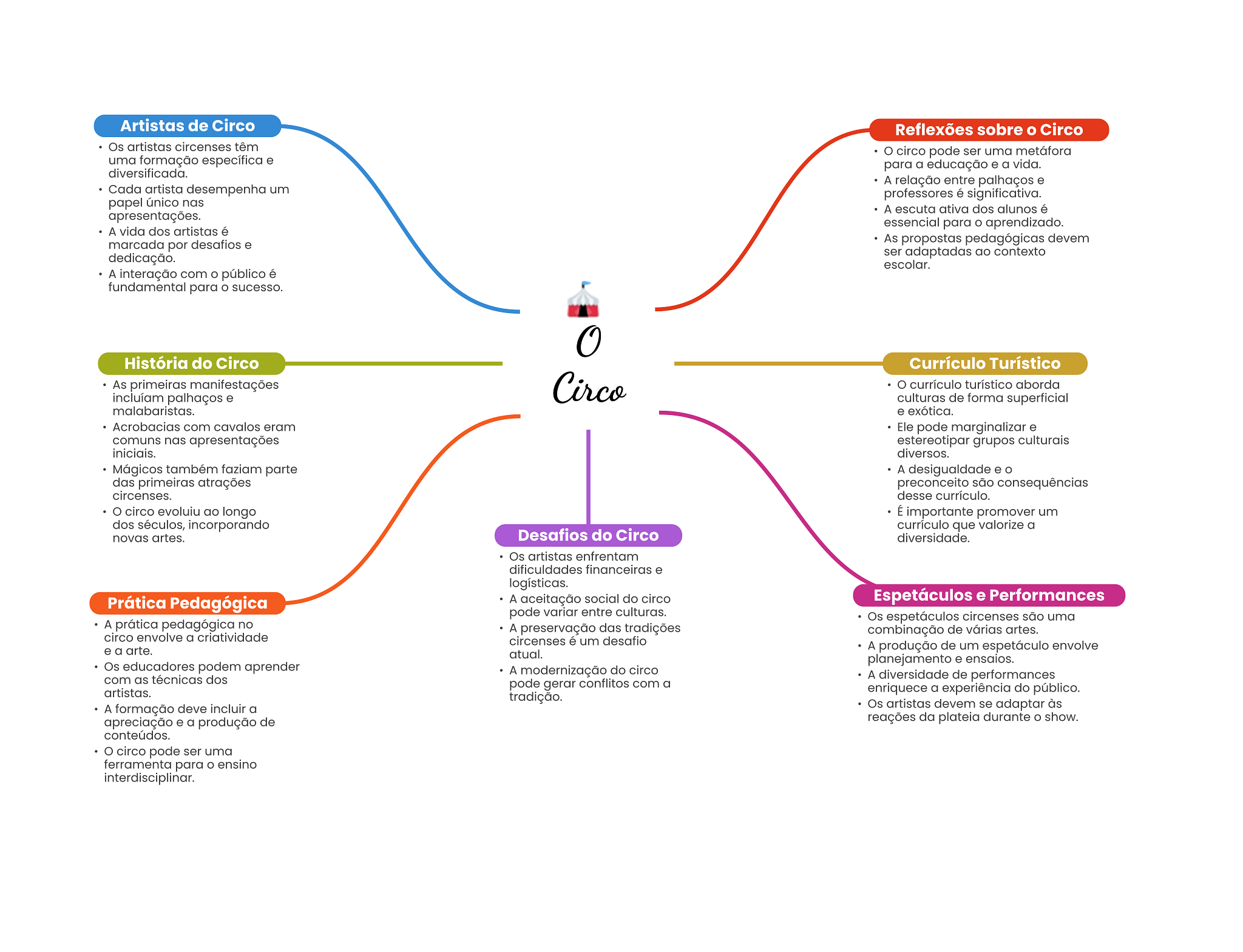 Artistas de Circo Reflexões sobre Circo Os artistas circenses têm circo pode ser uma metáfora uma formação específica e para a educação e a vida. diversificada. A relação entre palhaços e Cada artista desempenha um professores é significativa. papel único nas A escuta ativa dos alunos é apresentações. essencial para aprendizado. A vida dos artistas é marcada por desafios e As propostas pedagógicas devem dedicação. ser adaptadas ao contexto escolar. A interação com público é fundamental para sucesso. História do Circo Currículo Turístico As primeiras manifestações Circo currículo turístico aborda incluíam palhaços e culturas de forma superficial malabaristas. e exótica. Acrobacias com cavalos eram Ele pode marginalizar e comuns nas apresentações estereotipar grupos culturais iniciais. diversos. Mágicos também faziam parte A desigualdade e O das primeiras atrações preconceito são consequências circenses. desse currículo. circo evoluiu ao longo É importante promover um dos séculos, incorporando currículo que valorize a novas artes. Desafios do Circo diversidade. Os artistas enfrentam dificuldades financeiras e logísticas. Prática Pedagógica A aceitação social do circo Espetáculos e Performances pode variar entre culturas. Os espetáculos circenses são uma A prática pedagógica no A preservação das tradições combinação de várias artes. circo envolve a criatividade circenses é um desafio e a arte. A produção de um espetáculo envolve atual. planejamento e ensaios. Os educadores podem aprender A modernização do circo com as técnicas dos A diversidade de performances pode gerar conflitos com a artistas. enriquece a experiência do público. tradição. A formação deve incluir a Os artistas devem se adaptar às apreciação e a produção de reações da plateia durante O show. conteúdos. circo pode ser uma ferramenta para ensino interdisciplinar.