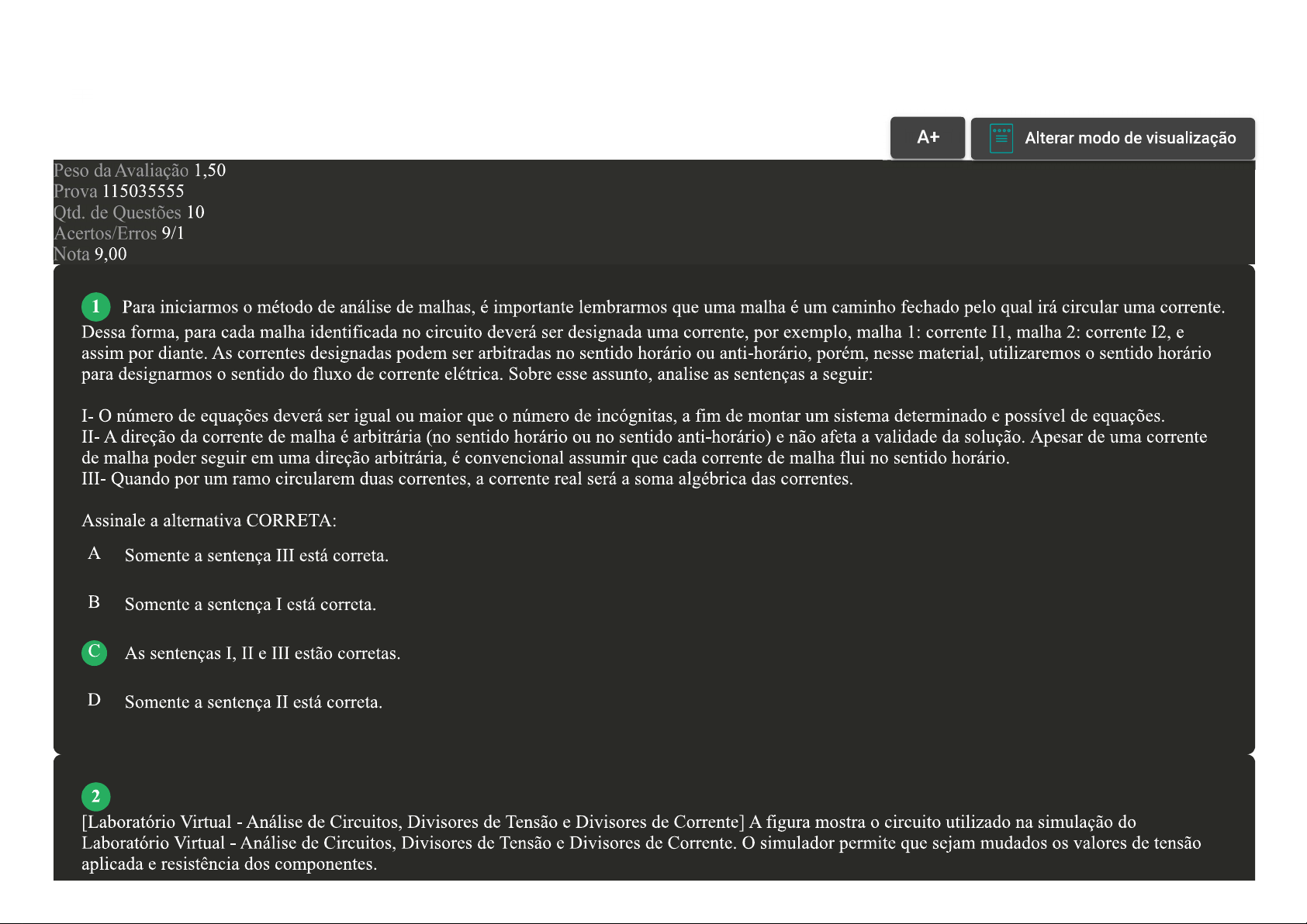 A+ Alterar modo de visualização Peso da Avaliação 1,50 Prova 115035555 Qtd. de Questões 10 Acertos/Erros 9/1 Nota 9,00 1 Para iniciarmos o método de análise de malhas, é importante lembrarmos que uma malha é um caminho fechado pelo qual irá circular uma corrente. Dessa forma, para cada malha identificada no circuito deverá ser designada uma corrente, por exemplo, malha 1: corrente I1, malha 2: corrente I2, e assim por diante. As correntes designadas podem ser arbitradas no sentido horário ou anti-horário, porém, nesse material, utilizaremos o sentido horário para designarmos o sentido do fluxo de corrente elétrica. Sobre esse assunto, analise as sentenças a seguir: I- número de equações deverá ser igual ou maior que o número de incógnitas, a fim de montar um sistema determinado e possível de equações. II- A direção da corrente de malha é arbitrária (no sentido horário ou no sentido anti-horário) e não afeta a validade da solução. Apesar de uma corrente de malha poder seguir em uma direção arbitrária, é convencional assumir que cada corrente de malha flui no sentido horário. III- Quando por um ramo circularem duas correntes, a corrente real será a soma algébrica das correntes. Assinale a alternativa CORRETA: A Somente a sentença III está correta. B Somente a sentença I está correta. As sentenças I, II e III estão corretas. D Somente a sentença II está correta. 2 [Laboratório Virtual Análise de Circuitos, Divisores de Tensão e Divisores de Corrente] A figura mostra o circuito utilizado na simulação do Laboratório Virtual Análise de Circuitos, Divisores de Tensão e Divisores de Corrente. simulador permite que sejam mudados os valores de tensão aplicada e resistência dos componentes.R1 1 2 V1 R2 R3 4 3 Assinale a alternativa CORRETA que apresenta o valor aproximado da tensão nos componentes do circuito, quando este é alimentado com uma tensão de 2,80 V, considerando os resistores R1 = 2E3 ohm; R2 = 1k2 ohm e R3 = 330 ohm: A VR1 = 2,46 V; VR2 340 mV e VR3 = 0,34 V. B VR1 = 1,43 V; VR2 = 1,37 V e VR3 = 1,73 V. VR1 = 1,37 V; VR2 0,43 V e VR3 430 mV. D VR1 = 2,80 V; VR2 = 1,40 V e VR3 1,40 V. 3 Quando falamos em associação de resistores em paralelo, podemos tomar como exemplo prático as ligações da rede elétrica de nossas residências, pois todas as tomadas estão distribuídas de tal forma que a tensão nela é de 220V ou 110V, dependendo da região do Brasil. Aparelhos, quando ligados em quaisquer partes da residência, terão d.d.p. constante de 220 V ou de 110 V. Com base nesse assunto, assinale a alternativa CORRETA: A Dois resistores em paralelo têm o comportamento de um único resistor, em que a resistência equivalente é igual ao produto das suas resistências subtraído pela soma das resistências. Dois resistores em paralelo têm o comportamento de um único resistor, em que a resistência equivalente é igual à soma das suas resistências dividido pela subtração das resistências. Dois resistores em paralelo têm o comportamento de um único resistor, em que a resistência equivalente é igual ao produto das suas resistências multiplicado pela soma das resistências. D Dois resistores em paralelo têm o comportamento de um único resistor, em que a resistência equivalente é igual ao produto das suas resistências dividido pela soma das resistências.4 Podemos classificar os circuitos elétricos como: Circuito Linear, onde cada elemento do circuito é linear ou uma fonte independente; Circuito Invariante, onde cada elemento do circuito é invariante ou uma fonte independente; Circuito Linear e Invariante, onde cada elemento do circuito é linear e invariante ou uma fonte independente; Circuitos Não Lineares; e Circuitos Variantes, que não são invariantes. Nessas definições, as fontes independentes precisam ser tratadas separadamente, pois elas exercem um papel diferente dos demais elementos da rede. Sobre esse assunto, classifique V para as sentenças verdadeiras e F para as falsas: ( ) Dessa forma, o resistor é considerado um elemento linear, pois atende às duas propriedades: a da homogeneidade e a aditiva. ( ) Os circuitos lineares apresentam a propriedade aditiva, essa propriedade pode ser expandida para circuitos que contenham mais de uma fonte independente. ( ) Para que um circuito seja considerado linear, os elementos que compõem esse circuito devem ser todas lineares, ou seja, todos os elementos devem atender à propriedade da homogeneidade e à propriedade aditiva. ( ) resistor pode ser considerado um elemento linear. Assinale a alternativa que apresenta a sequência CORRETA: A V-V-V-V. V-F-V-F. F-V-V-F. D V-F-F-V. 5 A necessidade de combinar resistores em série ou em paralelo ocorre tão frequentemente que essas conexões merecem uma atenção especial. processo de combinar resistores é mais fácil se os combinarmos de dois em dois. Com base nesse assunto, assinale a alternativa CORRETA: A Na associação em série de resistores, a resistência equivalente é obtida pela divisão dos resistores. Esse valor da resistência equivalente é o valor visto pela fonte, independente de quantos resistores estiverem em série.B Na associação em série de resistores, a resistência equivalente é obtida pela multiplicação dos resistores. Esse valor da resistência equivalente é o valor visto pela fonte, independente de quantos resistores estiverem em série. Na associação em série de resistores, a resistência equivalente é obtida pela soma dos resistores. Esse valor da resistência equivalente é o valor visto pela fonte, independente de quantos resistores estiverem em série. D Na associação em série de resistores, a resistência equivalente é obtida pela subtração dos resistores. Esse valor da resistência equivalente é o valor visto pela fonte, independente de quantos resistores estiverem em série. 6 Segundo o teorema de Thévenin, qualquer circuito elétrico linear, visto de um de