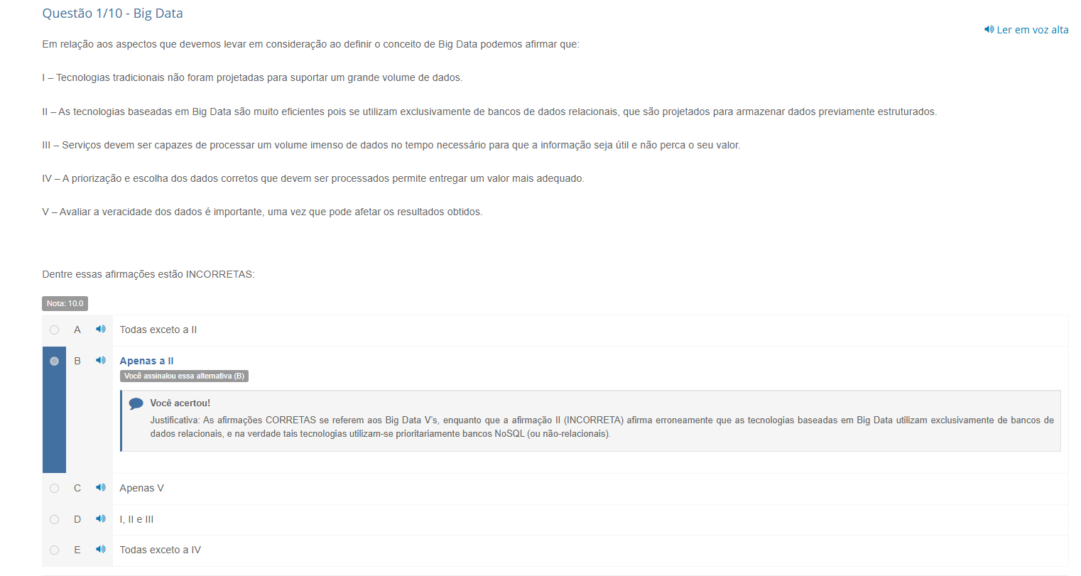 Questão 1/10 Big Data Ler em voz alta Em relação aos aspectos que devemos levar em consideração ao definir 0 conceito de Big Data podemos afirmar que: I Tecnologias tradicionais não foram projetadas para suportar um grande volume de dados. II - As tecnologias baseadas em Big Data são muito eficientes pois se utilizam exclusivamente de bancos de dados relacionais, que são projetados para armazenar dados previamente estruturados. III Serviços devem ser capazes de processar um volume imenso de dados no tempo necessário para que a informação seja útil e não perca seu valor. IV A priorização e escolha dos dados corretos que devem ser processados permite entregar um valor mais adequado. V Avaliar a veracidade dos dados é importante, uma vez que pode afetar OS resultados obtidos. Dentre essas afirmações estão INCORRETAS: Nota: 10.0 A Todas exceto a II B Apenas a II Você assinalou essa alternativa (B) Você acertou! Justificativa: As afirmações CORRETAS se referem aos Big Data V's, enquanto que a afirmação II (INCORRETA) afirma erroneamente que as tecnologias baseadas em Big Data utilizam exclusivamente de bancos de dados relacionais, e na verdade tais tecnologias utilizam-se prioritariamente bancos NoSQL (ou não-relacionais). C Apenas V D I, e III E Todas exceto a IV
