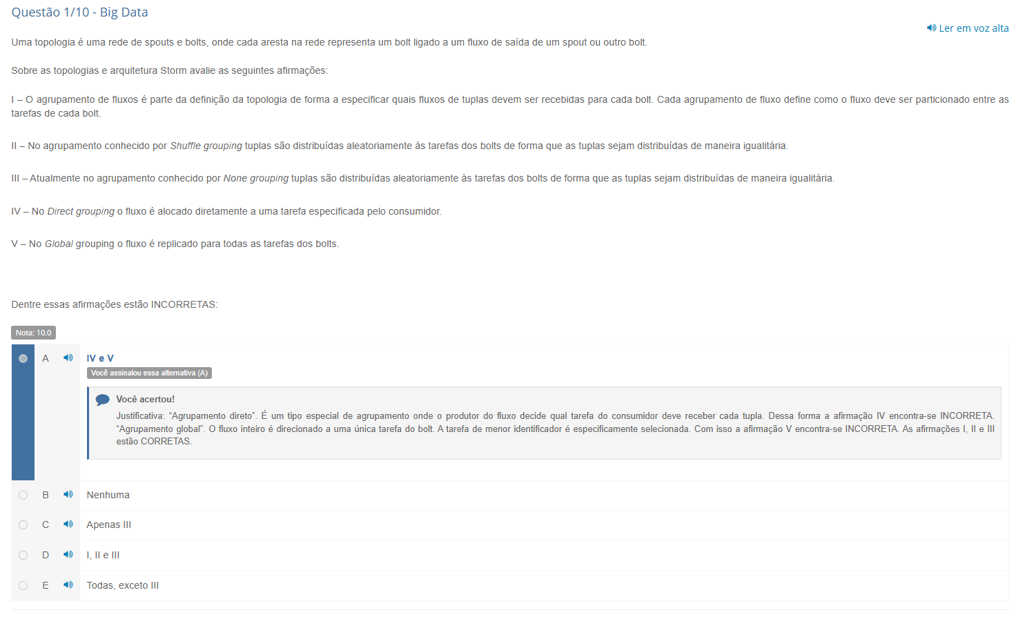Questão 1/10 Big Data Ler em voz alta Uma topologia é uma rede de spouts e bolts, onde cada aresta na rede representa um bolt ligado a um fluxo de saída de um spout ou outro bolt. Sobre as topologias e arquitetura Storm avalie as seguintes afirmações: I O agrupamento de fluxos é parte da definição da topologia de forma a especificar quais fluxos de tuplas devem ser recebidas para cada bolt. Cada agrupamento de fluxo define como 0 fluxo deve ser particionado entre as tarefas de cada bolt. II No agrupamento conhecido por Shuffle grouping tuplas são distribuídas aleatoriamente às tarefas dos bolts de forma que as tuplas sejam distribuídas de maneira igualitária. III Atualmente no agrupamento conhecido por None grouping tuplas são distribuídas aleatoriamente às tarefas dos bolts de forma que as tuplas sejam distribuídas de maneira igualitária. IV No Direct grouping fluxo é alocado diretamente a uma tarefa especificada pelo consumidor. V No Global grouping 0 fluxo é replicado para todas as tarefas dos bolts. Dentre essas afirmações estão INCORRETAS: Nota: 10.0 A Você assinalou essa alternativa (A) acertou! Justificativa: "Agrupamento É um tipo especial de agrupamento onde 0 produtor do fluxo decide qual tarefa do consumidor deve receber cada tupla. Dessa forma a afirmação IV encontra-se "Agrupamento fluxo inteiro é direcionado a uma única tarefa do bolt. A tarefa de menor identificador é especificamente Com isso a afirmação V encontra-se As afirmações I, II e III estão B Nenhuma C Apenas III D I, II III E Todas, exceto III