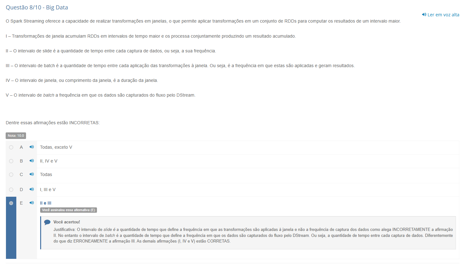 Questão 8/10 Big Data Ler em voz alta Spark Streaming oferece a capacidade de realizar transformações em janelas, 0 que permite aplicar transformações em um conjunto de RDDs para computar resultados de um intervalo maior. I Transformações de janela acumulam RDDs em intervalos de tempo maior e processa conjuntamente produzindo um resultado acumulado. II O intervalo de slide é a quantidade de tempo entre cada captura de dados, ou seja, a sua frequência. III O intervalo de batch é a quantidade de tempo entre cada aplicação das transformações à janela. Ou seja, é a frequência em que estas são aplicadas e geram resultados. IV O intervalo de janela, ou comprimento da janela, é a duração da janela. V O intervalo de batch a frequência em que OS dados são capturados do fluxo pelo DStream. Dentre essas afirmações estão INCORRETAS: Nota: 10.0 A Todas, exceto V B II, IV V C Todas D III e V E II III Você assinalou essa alternativa (E) Você acertou! Justificativa: intervalo de slide é a quantidade de tempo que define a frequência em que as transformações são aplicadas à janela e não a frequência de captura dos dados como alega INCORRETAMENTE a afirmação II. No entanto 0 intervalo de batch é a quantidade de tempo que define a frequência em que dados são capturados do fluxo pelo DStream. Ou seja, a quantidade de tempo entre cada captura de dados. Diferentemente do que diz ERRONEAMENTE a afirmação III. As demais afirmações (I, IV e V) estão