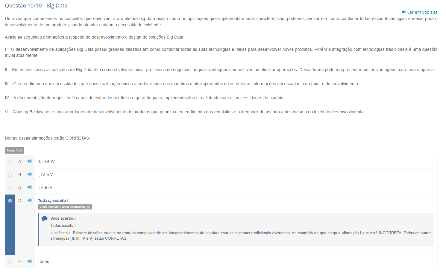 Questão 10/10 Big Data Ler em VOZ alta Uma vez que conhecemos conceitos que envolvem a arquitetura big data assim como as aplicações que implementam suas características, podemos pensar em como combinar todas essas tecnologias e ideias para 0 desenvolvimento de um produto visando atender a alguma necessidade existente. Avalie as seguintes afirmações a respeito do desenvolvimento e design de soluções Big Data: I desenvolvimento de aplicações Big Data possui grandes desafios em como combinar todas as suas tecnologias e ideias para desenvolver novos produtos. a integração com tecnologias tradicionais é uma questão trivial atualmente. II Em muitos casos as soluções de Big Data têm como objetivo otimizar processos de negócios, adquirir vantagens competitivas ou otimizar operações. Dessa forma podem representar muitas vantagens para uma empresa. III - O entendimento das necessidades que nossa aplicação busca atender é uma das maneiras mais importantes de se obter as informações necessárias para guiar 0 desenvolvimento IV A documentação de requisitos é capaz de evitar desperdícios e garantir que a implementação está alinhada com as necessidades do usuário. V Working Backwards é uma abordagem de desenvolvimento de produtos que prioriza entendimento dos requisitos e feedback do usuário antes mesmo do início do desenvolvimento. Dentre essas afirmações estão CORRETAS: Nota: 10.0 A II, III e IV B C I, IV D Todas, exceto I Você assinalou essa alternativa (D) Você acertou! Todas exceto I Justificativa: Existem desafios no que se trata da complexidade em integrar sistemas de big data com os sistemas tradicionais existentes. Ao contrário do que alega a afirmação I que está Todas as outras afirmações (II, III, IV e V) estão E Todas