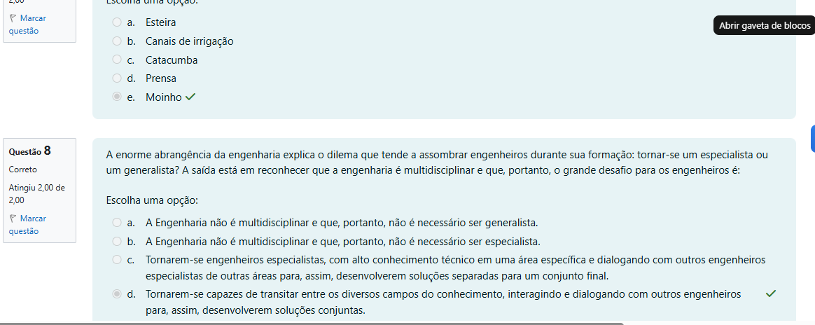 Marcar a. Esteira Abrir gaveta de blocos questão b. Canais de irrigação C. Catacumba d. Prensa e. Moinho Questão 8 A enorme abrangência da engenharia explica O dilema que tende a assombrar engenheiros durante sua formação: tornar-se um especialista ou Correto um generalista? A está em reconhecer que a engenharia é multidisciplinar e que, portanto, O grande desafio para engenheiros é: Atingiu 2,00 de 2,00 Escolha uma opção: Marcar a. A Engenharia não é multidisciplinar e que, portanto, não é necessário ser generalista. questão b. A Engenharia não é multidisciplinar e que, portanto, não é necessário ser especialista. C. Tornarem-se engenheiros especialistas, com alto conhecimento técnico em uma específica e dialogando com outros engenheiros especialistas de outras áreas para, assim, desenvolverem soluções separadas para um conjunto final. d. Tornarem-se capazes de transitar entre os diversos campos do conhecimento, interagindo e dialogando com outros engenheiros para, assim, desenvolverem soluções conjuntas.