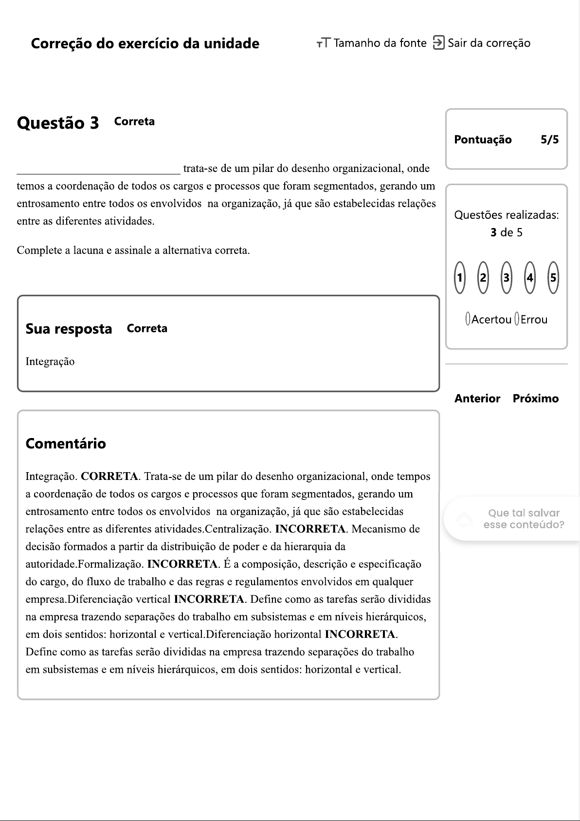 Correção do exercício da unidade TT Tamanho da fonte Sair da correção Questão 3 Correta Pontuação 5/5 trata-se de um pilar do desenho organizacional, onde temos a coordenação de todos os cargos e processos que foram segmentados, gerando um entrosamento entre todos os envolvidos na organização, já que são estabelecidas relações Questões realizadas: entre as diferentes atividades. 3 de 5 Complete a lacuna e assinale a alternativa correta. 1 2 3 4 5 Sua resposta Correta Integração Anterior Próximo Comentário Integração. CORRETA. Trata-se de um pilar do desenho organizacional, onde tempos a coordenação de todos os cargos e processos que foram segmentados, gerando um entrosamento entre todos os envolvidos na organização, já que são estabelecidas Que tal salvar relações entre as diferentes atividades. Centralização. INCORRETA. Mecanismo de esse conteúdo? decisão formados a partir da distribuição de poder e da hierarquia da autoridade. Formalização. INCORRETA. É a composição, descrição e especificação do cargo, do fluxo de trabalho e das regras e regulamentos envolvidos em qualquer empresa. Diferenciação vertical INCORRETA. Define como as tarefas serão divididas na empresa trazendo separações do trabalho em subsistemas e em níveis hierárquicos, em dois sentidos: horizontal e vertical. Diferenciação horizontal INCORRETA. Define como as tarefas serão divididas na empresa trazendo separações do trabalho em subsistemas e em níveis hierárquicos, em dois sentidos: horizontal e vertical.