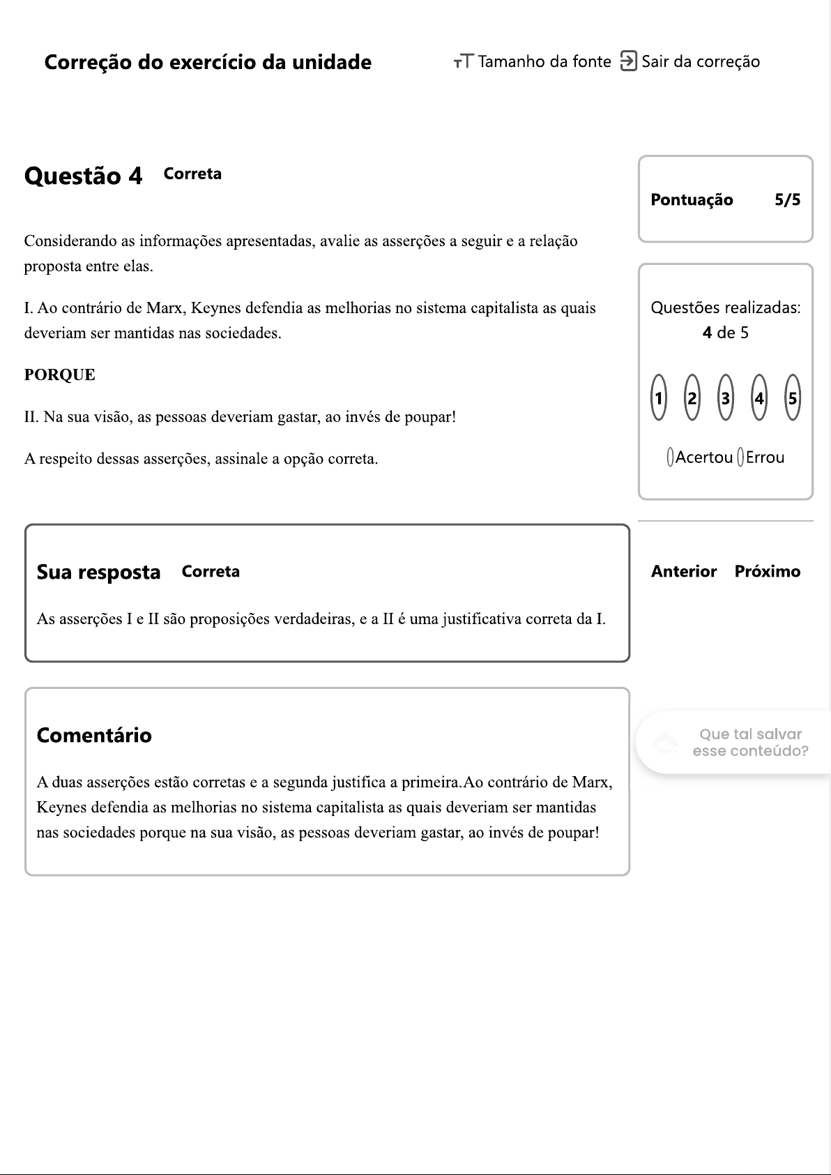 Correção do exercício da unidade TT Tamanho da fonte Sair da correção Questão 4 Correta Pontuação 5/5 Considerando as informações apresentadas, avalie as asserções a seguir e a relação proposta entre elas. I. Ao contrário de Marx, Keynes defendia as melhorias no sistema capitalista as quais Questões realizadas: deveriam ser mantidas nas sociedades. 4 de 5 PORQUE 1 2 3 4 5 II. Na sua visão, as pessoas deveriam gastar, ao invés de poupar! A respeito dessas asserções, assinale a opção correta. Sua resposta Correta Anterior Próximo As asserções I e II são proposições verdadeiras, e a II é uma justificativa correta da I. Comentário Que tal salvar esse conteúdo? A duas asserções estão corretas e a segunda justifica a primeira. Ao contrário de Marx, Keynes defendia as melhorias no sistema capitalista as quais deveriam ser mantidas nas sociedades porque na sua visão, as pessoas deveriam gastar, ao invés de poupar!