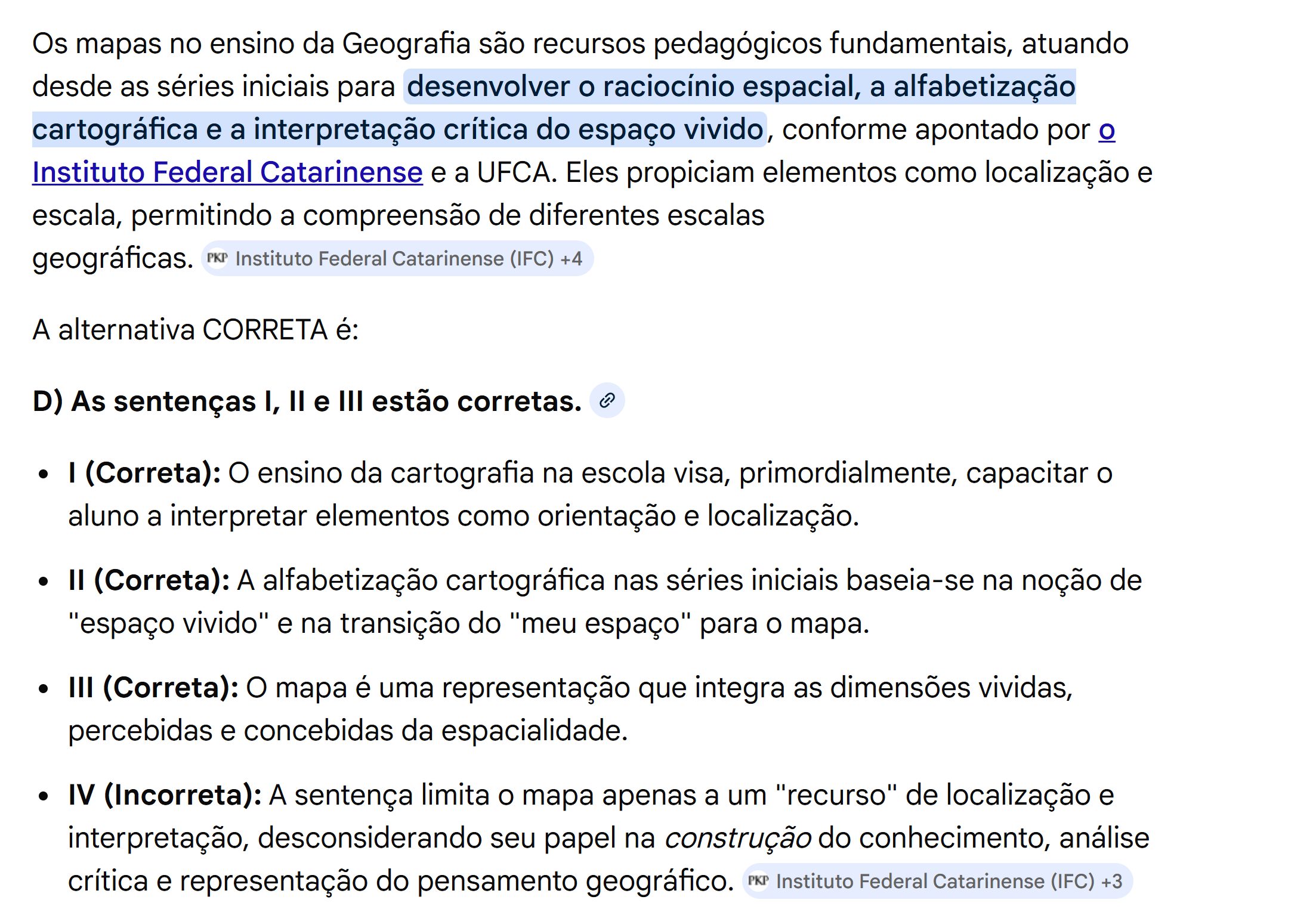 Os mapas no ensino da Geografia são recursos pedagógicos fundamentais, atuando desde as séries iniciais para desenvolver raciocínio espacial, a alfabetização cartográfica e a interpretação crítica do espaço vivido, conforme apontado por O Instituto Federal Catarinense e a UFCA. Eles propiciam elementos como localização e escala, permitindo a compreensão de diferentes escalas geográficas. PKP Instituto Federal Catarinense (IFC) +4 A alternativa CORRETA é: D) As sentenças I, e III estão corretas. I (Correta): ensino da cartografia na escola visa, primordialmente, capacitar aluno a interpretar elementos como orientação e localização. II (Correta): A alfabetização cartográfica nas séries iniciais baseia-se na noção de "espaço vivido" e na transição do "meu espaço" para mapa. III (Correta): O mapa é uma representação que integra as dimensões vividas, percebidas e concebidas da espacialidade. IV (Incorreta): A sentença limita mapa apenas a um "recurso" de localização e interpretação, desconsiderando seu papel na construção do conhecimento, análise crítica e representação do pensamento geográfico. PKP Instituto Federal Catarinense (IFC) +3