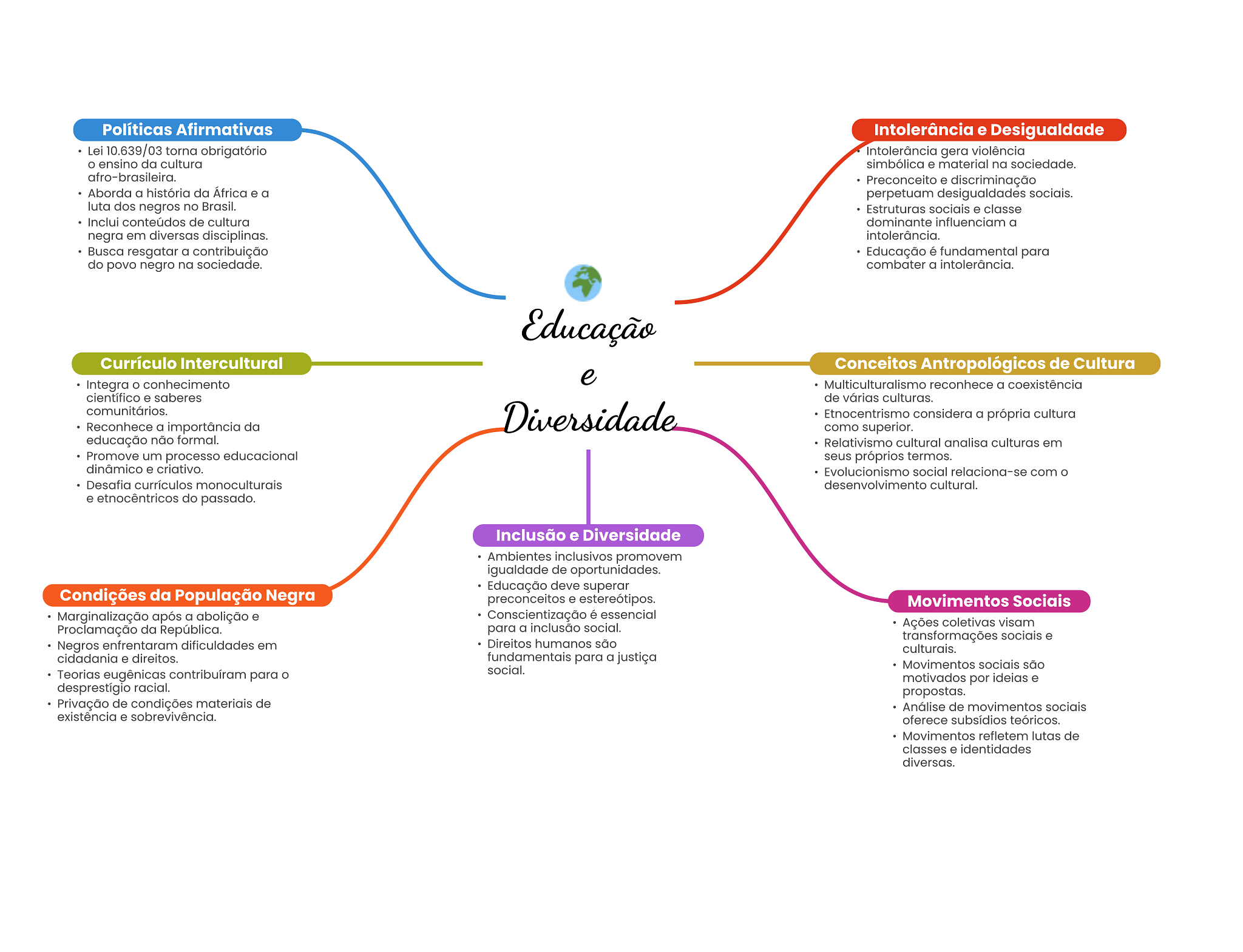 Políticas Afirmativas Intolerância e Desigualdade Lei 10.639/03 torna obrigatório Intolerância gera violência O ensino da cultura simbólica e material na sociedade. afro-brasileira. Preconceito e discriminação Aborda a história da África e a perpetuam desigualdades sociais. luta dos negros no Brasil. Estruturas sociais e classe Inclui conteúdos de cultura dominante influenciam a negra em diversas disciplinas. intolerância. Busca resgatar a contribuição Educação é fundamental para do povo negro na sociedade. combater a intolerância. Educação Currículo Intercultural Conceitos Antropológicos de Cultura e Integra conhecimento reconhece a coexistência científico e saberes de várias culturas. comunitários. Reconhece a importância da Diversidade Etnocentrismo considera a própria cultura como superior. educação não formal. Relativismo cultural analisa culturas em Promove um processo educacional seus próprios termos. dinâmico e criativo. Evolucionismo social relaciona-se com O Desafia currículos monoculturais desenvolvimento cultural. e etnocêntricos do passado. Inclusão e Diversidade Ambientes inclusivos promovem igualdade de oportunidades. Educação deve superar Condições da População Negra preconceitos e Movimentos Sociais Marginalização após a abolição e Conscientização é essencial Proclamação da República. para a inclusão social. Ações coletivas visam transformações sociais e Negros enfrentaram dificuldades em Direitos humanos são culturais. cidadania e direitos. fundamentais para a justiça social. Movimentos sociais são Teorias eugênicas contribuíram para motivados por ideias e desprestígio racial. propostas. Privação de condições materiais de Análise de movimentos sociais existência e sobrevivência. oferece subsídios teóricos. Movimentos refletem lutas de classes e identidades diversas.