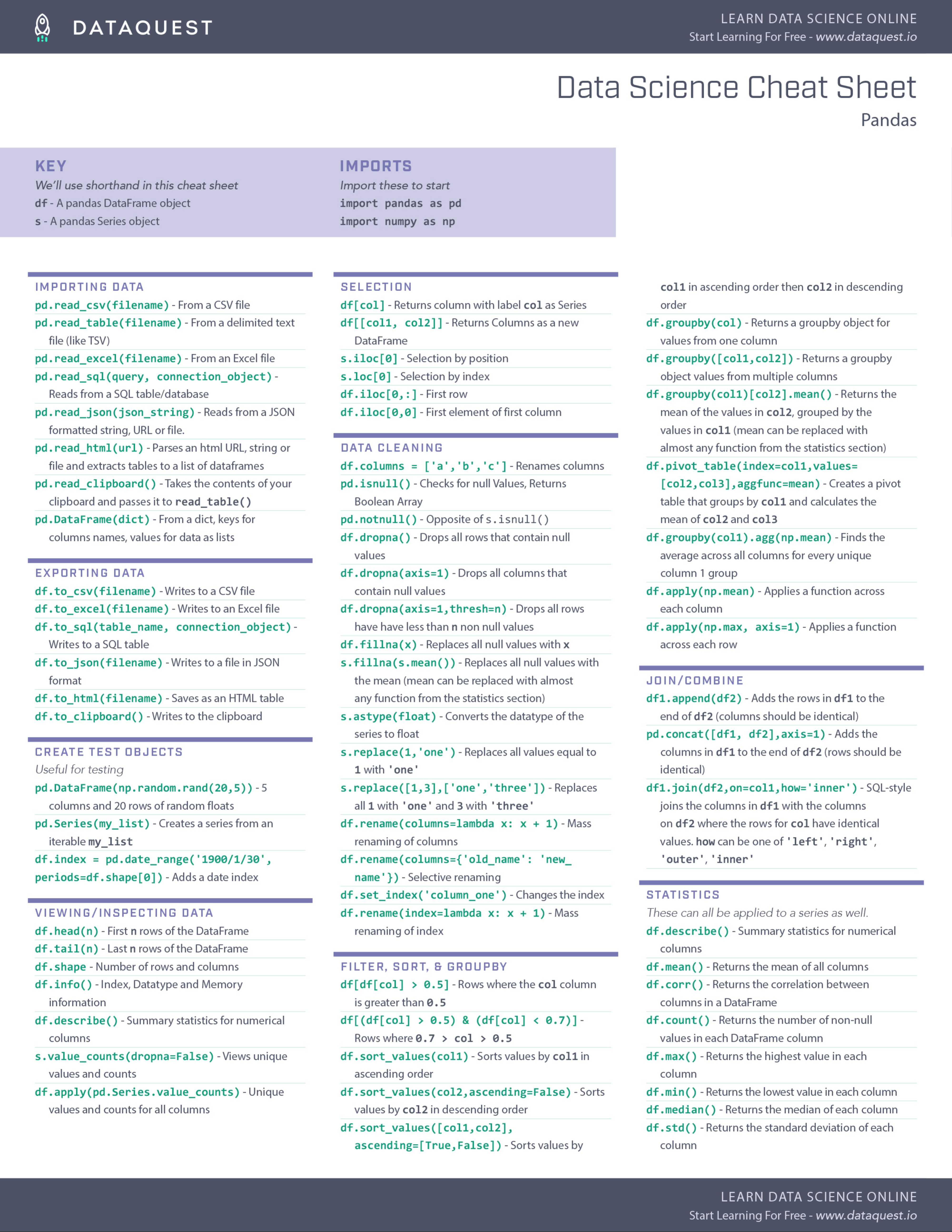 LEARN DATA SCIENCE ONLINE DATAQUEST Start Learning For Free - www.dataquest.io Data Science Cheat Sheet Pandas KEY IMPORTS We'll use shorthand in this cheat sheet Import these to start df A pandas DataFrame object import pandas as pd A pandas Series object import numpy as IMPORTING DATA SELECTION in ascending order then col2 in descending pd.read_csv(filename) From a CSV file df[col] Returns column with label col as Series order pd.read_table(filename) From a delimited text df[[col1, Returns Columns as a new df groupby(col) Returns a groupby object for file (like TSV) DataFrame values from one column pd.read_excel(filename) From an Excel file .iloc[0] Selection by position df groupby Returns a groupby connection_object) s.loc[0] Selection by index object values from multiple columns Reads from a SQL table/database df.iloc[0, First row groupby mean() Returns the pd. read_json(json_string) Reads from a JSON df.iloc[0,0] First element of first column mean of the values in grouped by the formatted string, URL or file. values in col1 (mean can be replaced with Parses an html URL, string or DATA CLEANING almost any function from the statistics section) file and extracts tables to a list of dataframes df.columns = ['a', 'b', 'c'] Renames columns d.read_clipboard() Takes the contents of your pd.isnull() Checks for null Values, Returns [col2, aggfunc=mean) - Creates a pivot clipboard and passes it to read_table() Boolean Array table that groups by col1 and calculates the From a dict, keys for pd.notnull() Opposite of s.isnull() mean of col2 and columns names, values for data as lists Drops all rows that contain null groupby agg(np.mean) Finds the values average across all columns for every unique EXPORTING DATA (axis=1) Drops all columns that column 1 group f.to_csv(filename) Writes to a CSV file contain null values apply(np.mean) Applies a function across df.to_excel(filename) - Writes to an Excel file thresh=n) - Drops all rows each column connection_object) have have less than n non null values df.apply(np.max, axis=1) - Applies a function Writes to a SQL table df.fillna(x) - Replaces all null values with X across each row df.to_json(filename) Writes to a file in JSON .fillna(s.mean()) Replaces all null values with format the mean (mean can be replaced with almost JOIN/COMBINE df.to_html(filename) Saves as an HTML table any function from the statistics section) df1. append - Adds the rows in df1 to the df.to_clipboard() Writes to the clipboard .astype(float) - Converts the datatype of the end of df2 (columns should be identical) series to float concat ([df1, df2], axis=1) Adds the CREATE TEST OBJECTS .replace(1, 'one') Replaces all values equal to columns in df1 to the end of df2 (rows should be Useful for testing 1 with 'one' identical) random. rand 5 ['one', 'three']) Replaces columns and 20 rows of random floats all 1 with 'one' and 3 with 'three' joins the columns in df1 with the columns pd.Series(my_list) Creates a series from an (columns=lambda x: + 1) Mass on df2 where the rows for col have identical iterable my_list renaming of columns values. how can be one of 'left', 'right', index = pd.date_range( '1900/1/30', df.rename(columns={'old_name': 'new_ 'outer', 'inner' periods=df.shape[0]) Adds a date index name'}) Selective renaming df.set_index(' column_one') Changes the index STATISTICS VIEWING/INSPECTING DATA rename (index=lambda x: + 1) Mass These can all be applied to a series as well. df.head(n) First n rows of the DataFrame renaming of index lf.describe() Summary statistics for numerical df.tail(n) - Last n rows of the DataFrame columns shape Number of rows and columns FILTER, SORT, & GROUPBY df.mean() - Returns the mean of all columns df.info() - Index, Datatype and Memory 0.5] Rows where the col column df.corr() Returns the correlation between information is greater than 0.5 columns in a DataFrame df.describe() Summary statistics for numerical df[(df[co]] > 0.5) & (df[col] 0.7)] df.count() - Returns the number of non-null columns Rows where 0.7 > col > 0.5 values in each DataFrame column s.value_counts(dropna=False) Views unique sort_values (col1) Sorts values by in df.max() Returns the highest value in each values and counts ascending order column df.apply(pd.Series.value_counts) - Unique sort_values ascending=False) Sorts df.min() Returns the lowest value in each column values and counts for all columns values by col2 in descending order df.median() - Returns the median of each column df.sort_values([col1,col2], df.std() - Returns the standard deviation of each ascending= False]) Sorts values by column LEARN DATA SCIENCE ONLINE Start Learning For Free www.dataquest.io