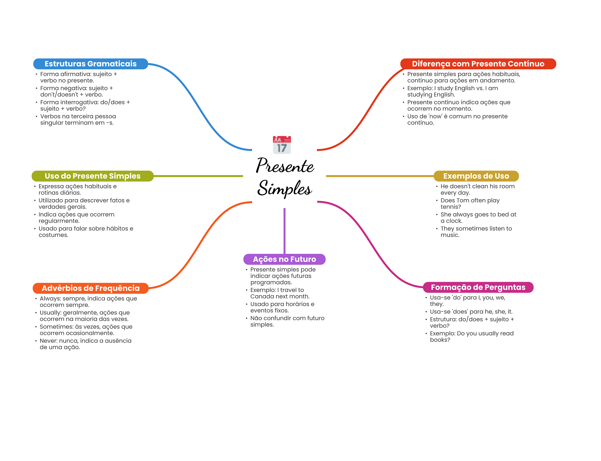 Estruturas Gramaticais Diferença com Presente Contínuo Forma afirmativa: sujeito + Presente simples para ações habituais, verbo no presente. contínuo para ações em andamento. Forma negativa: sujeito + Exemplo: I study English I am don't/doesn't + verbo. studying English. Forma interrogativa: do/does + Presente contínuo indica ações que sujeito + verbo? ocorrem no momento. Verbos na terceira pessoa Uso de 'now' é comum no presente singular terminam em contínuo. JUL 17 Presente Uso do Presente Simples Exemplos de Uso Expressa ações habituais e Simples He doesn't clean his room rotinas diárias. every day. Utilizado para descrever fatos e Does Tom often play verdades gerais. tennis? Indica ações que ocorrem She always goes to bed at regularmente. a clock. Usado para falar sobre hábitos e They sometimes listen to costumes. music. Ações no Futuro Presente simples pode indicar ações futuras programadas. Advérbios de Frequência Exemplo: I travel to Formação de Perguntas Always: sempre, indica ações que Canada next month. Usa-se 'do' para I, you, we, ocorrem sempre. Usado para horários e they. Usually: geralmente, ações que eventos fixos. Usa-se 'does' para he, she, it. ocorrem na maioria das vezes. Não confundir com futuro Estrutura: do/does + sujeito + Sometimes: às vezes, ações que simples. verbo? ocorrem ocasionalmente. Exemplo: Do you usually read Never: nunca, indica a ausência books? de uma ação.