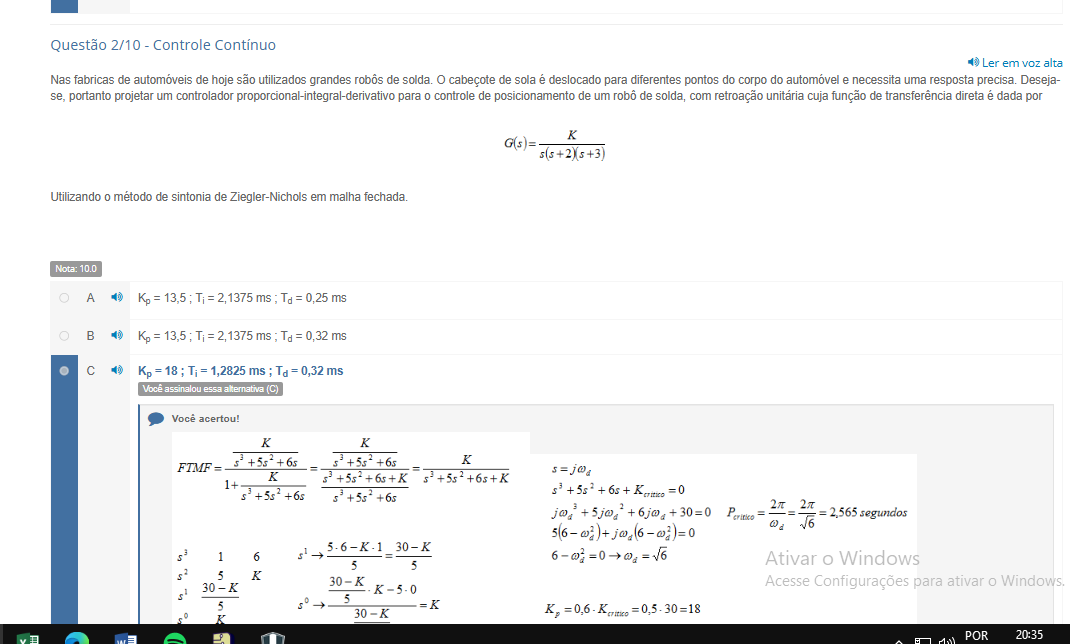 Questão 2/10 - Controle Contínuo Ler em voz alta Nas fabricas de automóveis de hoje são utilizados grandes de 0 cabeçote de sola é deslocado para diferentes pontos do corpo do automóvel e necessita uma resposta precisa. Deseja- se, portanto projetar um controlador proporcional-integral-derivativo para 0 controle de posicionamento de um robo de solda, com retroação unitária cuja função de transferência direta dada por Utilizando 0 método de sintonia de Ziegler-Nichols em malha Nota: 10.0 A 13,5 ms Td 0,25 ms B = 13,5 = 1375 ms : Td 0,32 ms C Você assinalou essa alternativa (C) Você acertou! K K FTMF K = = = K 1+ 2π 2π = 2,565 segundos 1 6 Ativar O Windows 5 K 30 30-K K-5-0 Acesse Configurações para ativar Windows. 5 5 K 30-K K POR 20:35