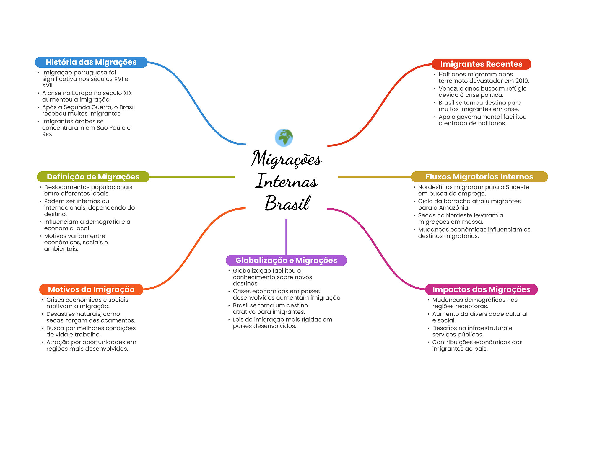 História das Migrações Imigrantes Recentes Imigração portuguesa foi Haitianos migraram após significativa nos séculos XVI e terremoto devastador em 2010. XVII. Venezuelanos buscam refúgio A crise na Europa no século XIX devido à crise política. aumentou a imigração. Brasil se tornou destino para Após a Segunda Guerra, Brasil muitos imigrantes em crise. recebeu muitos imigrantes. Apoio governamental facilitou Imigrantes árabes se a entrada de haitianos. concentraram em São Paulo e Rio. Migrações Definição de Migrações Internas Fluxos Migratórios Internos Deslocamentos populacionais Nordestinos migraram para Sudeste entre diferentes locais. em busca de emprego. Podem ser internas ou internacionais, dependendo do Brasil Ciclo da borracha atraiu migrantes para a Amazônia. destino. Secas no Nordeste levaram a Influenciam a demografia e a migrações em massa. economia local. Mudanças econômicas influenciam Motivos variam entre destinos migratórios. econômicos, sociais e ambientais. Globalização e Migrações Globalização facilitou conhecimento sobre novos destinos. Motivos da Imigração Crises econômicas em países Impactos das Migrações Crises econômicas e sociais desenvolvidos aumentam imigração. Mudanças demográficas nas motivam a migração. Brasil se torna um destino regiões receptoras. Desastres naturais, como atrativo para imigrantes. Aumento da diversidade cultural secas, forçam deslocamentos. Leis de imigração mais rígidas em e social. Busca por melhores condições países desenvolvidos. Desafios na infraestrutura e de vida e trabalho. serviços públicos. Atração por oportunidades em Contribuições econômicas dos regiões mais desenvolvidas. imigrantes ao país.