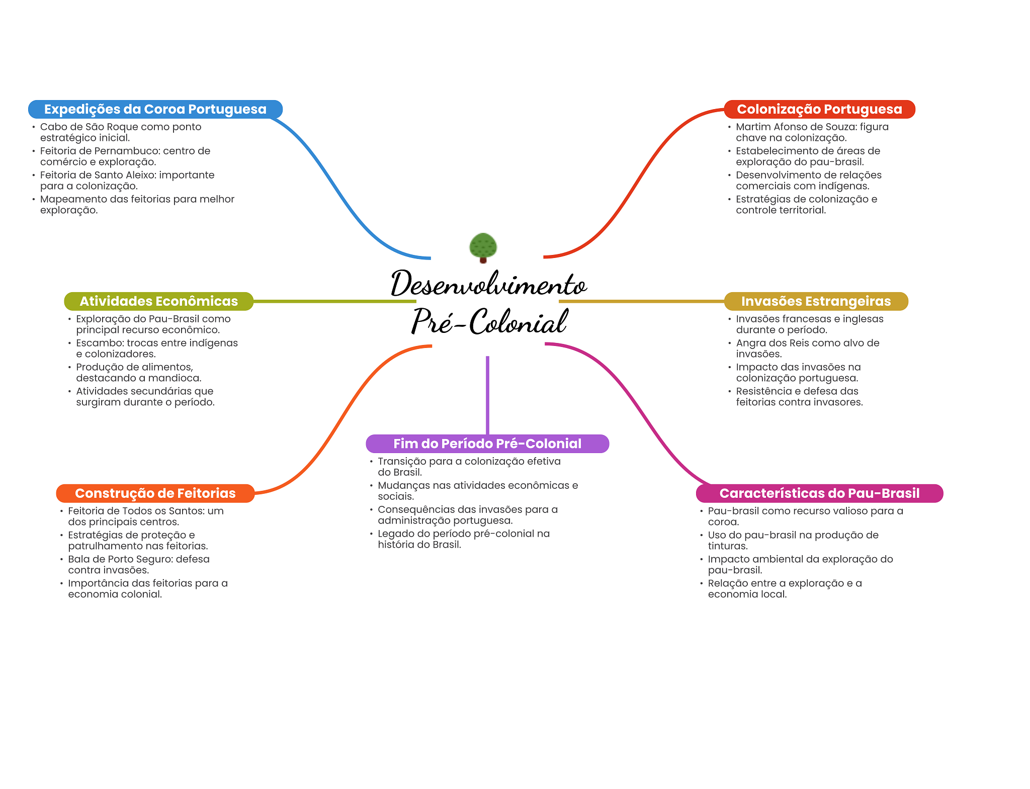 Expedições da Coroa Portuguesa Colonização Portuguesa Cabo de São Roque como ponto Martim Afonso de Souza: figura estratégico inicial. chave na colonização. Feitoria de Pernambuco: centro de Estabelecimento de áreas de comércio e exploração. exploração do pau-brasil. Feitoria de Santo Aleixo: importante Desenvolvimento de relações para a colonização. comerciais com indígenas. Mapeamento das feitorias para melhor Estratégias de colonização e exploração. controle territorial. Desenvolvimento Atividades Econômicas Invasões Estrangeiras Exploração do Pau-Brasil como Pré-Colonial Invasões francesas e inglesas principal recurso econômico. durante período. Escambo: trocas entre indígenas Angra dos Reis como alvo de e colonizadores. invasões. Produção de alimentos, Impacto das invasões na destacando a mandioca. colonização portuguesa. Atividades secundárias que Resistência e defesa das surgiram durante período. feitorias contra invasores. Fim do Período Pré-Colonial Transição para a colonização efetiva do Brasil. Mudanças nas atividades econômicas e Construção de Feitorias sociais. Características do Pau-Brasil Feitoria de Todos Santos: um Consequências das invasões para a Pau-brasil como recurso valioso para a dos principais centros. administração portuguesa. coroa. Estratégias de proteção e Legado do período pré-colonial na Uso do pau-brasil na produção de patrulhamento nas feitorias. história do Brasil. tinturas. Bala de Porto Seguro: defesa Impacto ambiental da exploração do contra invasões. pau-brasil. Importância das feitorias para a Relação entre a exploração e a economia colonial. economia local.
