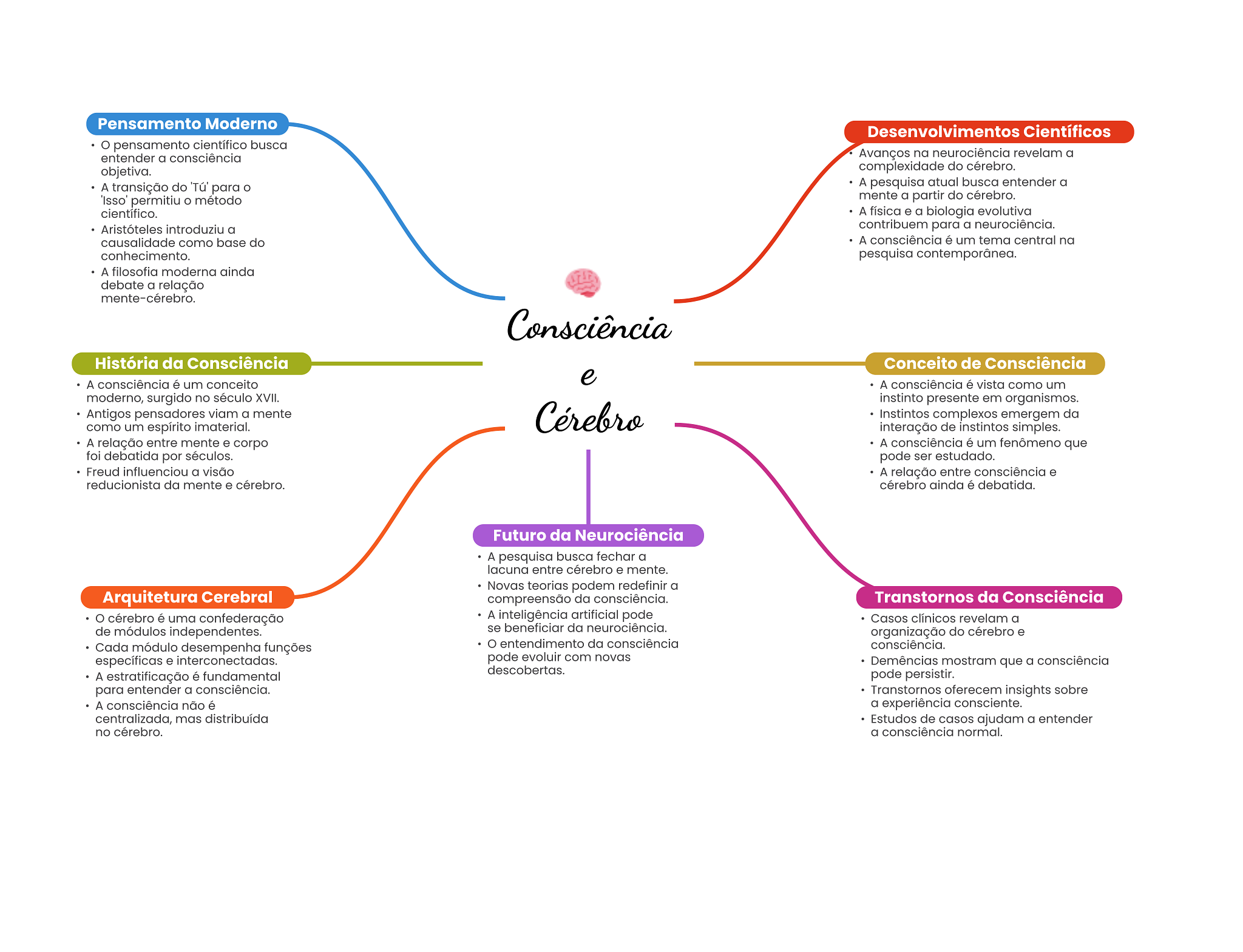 Pensamento Moderno Desenvolvimentos Científicos pensamento científico busca entender a consciência Avanços na neurociência revelam a objetiva. complexidade do cérebro. A transição do 'Tú' para A pesquisa atual busca entender a 'Isso' permitiu método mente a partir do cérebro. científico. A física e a biologia evolutiva Aristóteles introduziu a contribuem para a neurociência. causalidade como base do A consciência é um tema central na conhecimento. pesquisa contemporânea. A filosofia moderna ainda debate a relação mente-cérebro. Consciência História da Consciência Conceito de Consciência A consciência é um conceito e A consciência é vista como um moderno, surgido no século XVII. instinto presente em organismos. Antigos pensadores viam a mente como um espírito imaterial. Cérebro Instintos complexos emergem da interação de instintos simples. A relação entre mente e corpo A consciência é um fenômeno que foi debatida por séculos. pode ser estudado. Freud influenciou a visão A relação entre consciência e reducionista da mente e cérebro. cérebro ainda é debatida. Futuro da Neurociência A pesquisa busca fechar a lacuna entre cérebro e mente. Novas teorias podem redefinir a Arquitetura Cerebral compreensão da consciência. Transtornos da Consciência cérebro é uma confederação A inteligência artificial pode Casos clínicos revelam a de módulos independentes. se beneficiar da neurociência. organização do cérebro e Cada módulo desempenha funções entendimento da consciência consciência. específicas e interconectadas. pode evoluir com novas Demências mostram que a consciência descobertas. A estratificação é fundamental pode persistir. para entender a consciência. Transtornos oferecem insights sobre A consciência não é a experiência consciente. centralizada, mas distribuída Estudos de casos ajudam a entender no cérebro. a consciência normal.