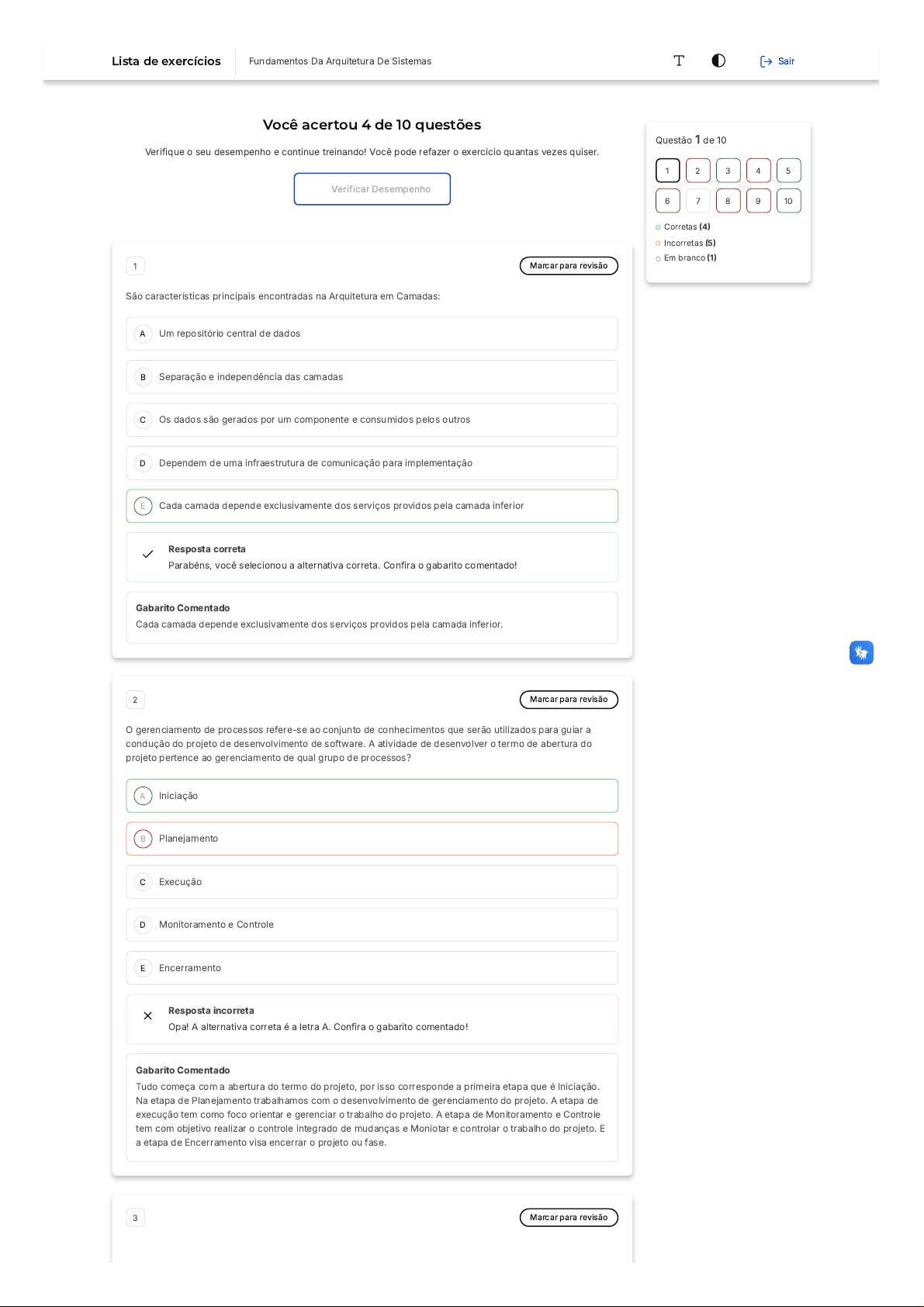 Você acertou 4 de 10 questões Verifique o seu desempenho e continue treinando! Você pode refazer o exercício quantas vezes quiser. Verificar Desempenho A B C D E A B C D E 1 Marcar para revisão São características principais encontradas na Arquitetura em Camadas: Um repositório central de dados Separação e independência das camadas Os dados são gerados por um componente e consumidos pelos outros Dependem de uma infraestrutura de comunicação para implementação Cada camada depende exclusivamente dos serviços providos pela camada inferior Resposta correta Parabéns, você selecionou a alternativa correta. Confira o gabarito comentado! Gabarito Comentado Cada camada depende exclusivamente dos serviços providos pela camada inferior. 2 Marcar para revisão O gerenciamento de processos refere-se ao conjunto de conhecimentos que serão utilizados para guiar a condução do projeto de desenvolvimento de software. A atividade de desenvolver o termo de abertura do projeto pertence ao gerenciamento de qual grupo de processos? Iniciação Planejamento Execução Monitoramento e Controle Encerramento Resposta incorreta Opa! A alternativa correta é a letra A. Confira o gabarito comentado! Gabarito Comentado Tudo começa com a abertura do termo do projeto, por isso corresponde a primeira etapa que é Iniciação. Na etapa de Planejamento trabalhamos com o desenvolvimento de gerenciamento do projeto. A etapa de execução tem como foco orientar e gerenciar o trabalho do projeto. A etapa de Monitoramento e Controle tem com objetivo realizar o controle integrado de mudanças e Moniotar e controlar o trabalho do projeto. E a etapa de Encerramento visa encerrar o projeto ou fase. 3 Marcar para revisão Questão 1 de 10 Corretas (4) Incorretas (5) Em branco (1) 1 2 3 4 5 6 7 8 9 10 Lista de exercícios Fundamentos Da Arquitetura De Sistemas Sair A B C D E A B C D E A B C Uma empresa realizou um levantamento de requisitos de um Estacionamento, onde num primeiro momento destacou duas funcionalidades principais: - Atendente registra a entrada e saída do veículo, mas é importante frisar que quando o cliente estaciona o veículo ele recebe o ticket onde contém a data e hora de entrada, placa, a cor do veículo e o modelo do carro. - Quando o cliente retira o veículo do estacionamento ele recebe o comprovante de pagamento (fatura). É correto afirmar que: Existe um relacionamento do tipo include do caso de uso Registrar Entrada para o caso de uso Gerar ticket impresso, onde este é essencial para o comportamento do caso de uso Registrar Entrada. Existe um relacionamento do tipo extend do caso de uso Registrar Entrada para o caso de uso Gerar ticket impresso, onde este é essencial para o comportamento do caso de uso Registrar Entrada. Existe um relacionamento do tipo extend do caso de uso Gerar Fatura para o caso de uso Registrar Saída, onde este é essencial para o comportamento do caso de uso Registrar Entrada. Existe um relacionamento do tipo include do caso de uso Gerar Fatura para o caso de uso Registrar Saída, onde este é opcional para o comportamento do caso de uso Registrar Entrada. Existe um relacionamento do tipo generalização docaso de uso Gerar Fatura para o caso de uso registrar Saída, onde define uma funcionalidade do sistema do ponto de vista do usuário. Resposta correta Parabéns, você selecionou a alternativa correta. Confira o gabarito comentado! Gabarito Comentado O relacionamento é do tipo include, uma vez que é obrigatório executar o caso de uso gerar ticket impresso, e este é chamado pelo caso de uso registrar entrada.. 4 Marcar para revisão Em relação aos níveis de modelo, descubra qual modelo que é independente do tipo de software ou de tecnologia, e representa o problema a ser resolvido. Modelo de Implementação Modelo de Especificação Modelo de Projeto Modelo de Requisitos Modelo Conceitual Resposta incorreta Opa! A alternativa correta é a letra E. Confira o gabarito comentado! Gabarito Comentado Modelo Conceitual. 5 Marcar para revisão Sobre os Componentes de um Sistema, as questões abaixo são verdadeiras, EXCETO: Podem ser definidos desde a primeira iteração do projeto de arquitetura. O nível de abstração é, geralmente, alto. Devem ser projetados buscando a alta coesão e o baixo acoplamento. D E A B C D E A B C D E Devem possuir interfaces bem definidas, preferencialmente uma para cada serviço solicitado. Seguindo o princípio da alta coesão, cada componente deve ter no máximo 3 interfaces. Resposta correta Parabéns, você selecionou a alternativa correta. Confira o gabarito comentado! Gabarito Comentado Seguindo o princípio da alta coesão, cada componente deve ter no máximo 3 interfaces. 6 Marcar para revisão São características que levaram à especificação do Modelo de Componentes CORBA, EXCETO: Falta de flexibilidade para estender as funcionalidades dos objetos. Requisitos não funcionais eram usualmente especificados junto com o métodos do negócio (funcionais). Necessidade da especialização das interfaces (conexões) entre os objetos. Dificuldade de configurar e utilizar aplicações em padrões anteriores. Necessidade da existência de um mecanismo único de implementação. Resposta incorreta Opa! A alternativa correta é a letra E. Confira o gabarito comentado! Gabarito Comentado Necessidade da existência de um mecanismo único de implementação. 7 Marcar para revisão A metodologia de gestão deve contemplar quantas fases forem necessárias para conseguir que todas as áreas de conhecimento sejam abordadas de forma a garantir que escopo, tempo, custos e qualidade atinjam os níveis definidos pelas corporações como sendo os ideais. Qual o modelo de desenvolvimento, estas fases da metodologia devem seguir? Cascata Cascata com retroalimentação Espiral Incremental Iterativo e incremental Questão não respondida Opa! A alternativa correta é a letra E. Confira o gabarito comentado! Gabarito Comentado Iterati
