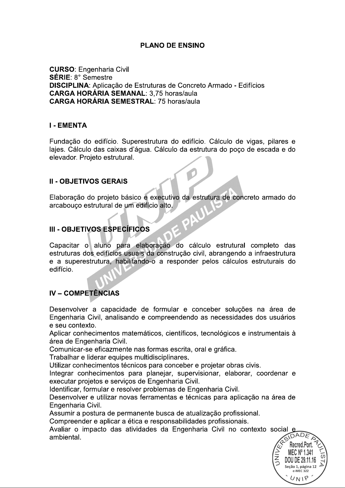 PLANO DE ENSINO CURSO: Engenharia Civil SÉRIE: 8° Semestre DISCIPLINA: Aplicação de Estruturas de Concreto Armado Edifícios CARGA HORÁRIA SEMANAL: 3,75 horas/aula CARGA HORÁRIA SEMESTRAL: 75 horas/aula I - EMENTA Fundação do edifício. Superestrutura do edifício. Cálculo de vigas, pilares e lajes. Cálculo das caixas d'água. Cálculo da estrutura do poço de escada e do elevador. Projeto estrutural. II OBJETIVOS GERAIS arcabouço estrutural de um edifício alto. Elaboração do projeto básico e executivo PAULIS da estrutura de concreto armado do III OBJETIVOS ESPECÍFICOS Capacitar aluno para elaboração do cálculo estrutural completo das estruturas dos edifícios usuais da construção civil, abrangendo a infraestrutura edifício. e a superestrutura, habilitando-o a responder pelos cálculos estruturais do IV COMPETÊNCIAS Desenvolver a capacidade de formular e conceber soluções na área de Engenharia Civil, analisando e compreendendo as necessidades dos usuários e seu contexto. Aplicar conhecimentos matemáticos, científicos, tecnológicos e instrumentais à área de Engenharia Civil. Comunicar-se eficazmente nas formas escrita, oral e gráfica. Trabalhar e liderar equipes multidisciplinares. Utilizar conhecimentos técnicos para conceber e projetar obras civis. Integrar conhecimentos para planejar, supervisionar, elaborar, coordenar e executar projetos e serviços de Engenharia Civil. Identificar, formular e resolver problemas de Engenharia Civil. Desenvolver e utilizar novas ferramentas e técnicas para aplicação na área de Engenharia Civil. Assumir a postura de permanente busca de atualização profissional. Compreender e aplicar a ética e responsabilidades profissionais. Avaliar o impacto das atividades da Engenharia Civil no contexto social e ambiental. DOU DE 29.11.16 Port. N° 1.341 Seção 1, página 12 e-MEC 322 UNIPAvaliar a viabilidade econômica de projetos de engenharia; Desenvolver atribuição técnica e gerencial para se responsabilizar legalmente por projetos e gerenciamento de obras no âmbito de sua especialização. V CONTEÚDO PROGRAMÁTICO Cálculo estrutural de estacas, tubulões e sapatas. Cálculo estrutural das caixas d'água. Cálculo estrutural do poço de escadas e poço de elevadores. Cálculo da rigidez e deformações do edifício. Cálculo estrutural dos pilares, vigas e lajes do edifício. de laje de heliporto de um edifício. Dimensionamento das escadas do edifício. VI ESTRATÉGIA DE TRABALHO As disciplinas são ministradas preferencialmente por meio de aulas expositivas, metodologias ativas e diversificadas apoiadas nos planos de ensino. O desenvolvimento dos conceitos e conteúdos ocorre com apoio de propostas de leituras de e artigos científicos básicos e complementares, exercícios, discussões em fórum/chats ou presenciais quando for caso, sugestões de filmes, vídeos e demais recursos audiovisuais. Com objetivo de aprofundar e enriquecer domínio dos conhecimentos e incentivar a pesquisa, docente pode propor trabalhos individuais ou em grupo, palestras, atividades complementares e práticas em diferentes cenários, que permitam aos alunos VII AVALIAÇÃO assimilarem os conhecimentos INIVERSI essenciais para sua formação. A apuração do rendimento escolar é realizada por meio de verificações parciais e exames, conforme previsto no Regimento Institucional. VIII BIBLIOGRAFIA BÁSICA BOTELHO, Manoel Henrique Campos; MARCHETTI, Osvaldemar. Concreto Armado eu te amo Volume 1. ed revista segundo a nova norma de concreto armado NBR 6118/2014. São Paulo. Editora Blucher. 2015. ISBN: 978-85-212-0707-8 FAKURY, Ricardo Hallal; CASTRO E SILVA, Ana Lídia Reis; CALDAS, Rodrigo Barreto. Dimensionamento de elementos estruturais de aço e mistos de aço e concreto. Barueri, São Paulo. Pearson Education do Brasil. 2016. ISBN 978-85- 430-0112-8 Seção 1, página PAULISTA 12 Recred. Port. N° 1.341 DOU DE 29.11.16 e-MEC 322 UNIPPORTO, Thiago Bomjardim; FERNANDES, Danielle Stefane Gualberto. Curso Básico de Concreto Armado. São Paulo.Editora Oficina de Textos. 2015. ISBN 978-85-7975-187-5 COMPLEMENTAR BOTELHO, Manoel Henrique Campos; FERRAZ, Nelson Newton. Concreto Armado eu te amo vai para a obra. ed revista segundo a nova norma de concreto armado NBR 6118/2014. São Paulo. Editora Blucher. 2018. ISBN: 978-85-212-0996-6 FUSCO, Péricles Brasiliense; ONISHI, Minoru. Introdução à Engenharia de Estruturas de Concreto. São Paulo. Editora Cengage. 2017. ISBN: 978-85-212- 2777-1. PILOTTO NETO, Egydio. Caderno de Receitas de Concreto Armado: Vigas - Volume 1. ed. Rio de Janeiro. Editora LTC. 2018. ISBN: 978-85-216-3468-3 PILOTTO NETO, Egydio. Caderno de Receitas de Concreto Armado: Lajes - Volume 3. ed. Rio de Janeiro. Editora LTC. 2018. ISBN: 978-85-216-3464-5 SALGADO, Julio Cesar Pereira. Estruturas na Construção Civil. Ed. São Paulo. Editora UNIVERSIDADE Érica/Saraiva. 2014. ISBN: 978-85-365-1867-1. Recred.Port. 29.11.16 1.341 PAULISTA Seção 1, página 12 e-MEC 322 UNIP