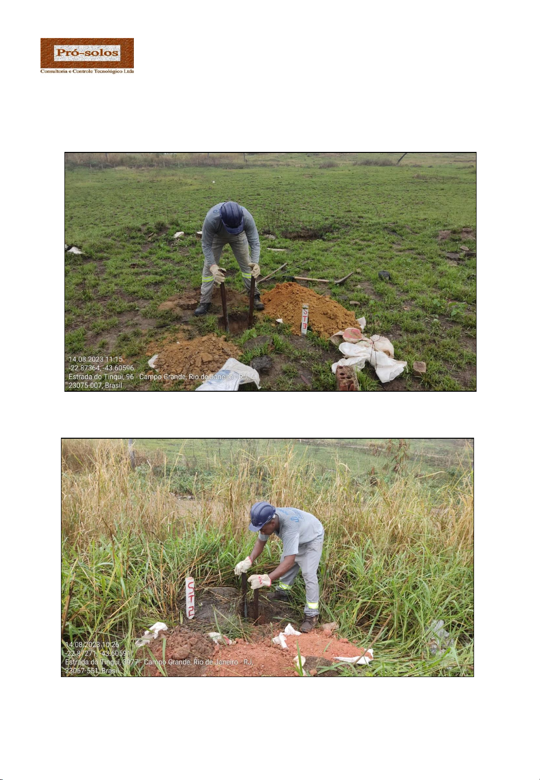 Urbanização da Estrada do Tingui Agosto 2023 001 RELATÓRIO DO ESTUDO Investigação Geotécnica ( sondagens à trado (ST)) Z Investigação geotécnica - Sondagens a trado (ST) Obra: Urbanização da Estrada do Tingui Local: Campo Grande - RJ Trecho: Ligação Viária com Avenida Brasil Empresa: Construtora Metropolitana S.A 001 RELATÓRIO Agosto 2023 28/08/2023 Emissão Revisão Verificação Visto Aprovação Sumário 1 – Introdução 2 – Objetivo 3 – Métodos de Referência 4 – Sondagens ST e TR 5 – Recursos Humanos e Materiais 6 – Procedimento Operacional 7 – Estudo Geotécnico / resultados dos ensaios das amostras representativas do pavimento existente 7.1 – Boletins de sondagens das amostras representativas. 7.2 – Quadros de resumo dos ensaios de granulometria por peneiramento, LL, LP, compactação, CBR e expansão das amostras representativas. 7.3 - Fichas dos ensaios de granulometria por peneiramento, LL, LP, compactação, CBR e expansão das amostras representativas. 8 – Documentos Complementares 8.1 – Acompanhamento fotográfico ST 1 – INTRODUÇÃO 2 – OBJETIVO 3 – MÉTODOS DE REFERÊNCIA 4 – SONDAGENS ST 5 – RECURSOS HUMANOS E MATERIAIS 6 – PROCEDIMENTO OPERACIONAL 1 – Introdução Este documento apresenta a descrição das atividades desempenhadas pela PRÓ-SOLOS Consultoria e Controle Tecnológico LTDA, contratada pela empresa CONSTRUTORA METROPOLITANA S.A. Na Obra de Urbanização da Estrada do Tingui, no trecho Ligação Viária com Avenida Brasil – Campo Grande - RJ; descrevendo os métodos utilizados e expondo os dados obtidos. O relatório apresenta o estudo geotécnico, visando avaliar a estrutura do pavimento existente na via. A investigação de campo envolveu a abertura de 10 sondagens a trado , coletas de amostras deformadas, do pavimento existente, para ensaios de caracterização, compactação PN, CBR PN, e expansão; verificação do grau de compactação, elaboração de boletins de sondagens, classificação expedita das amostras representativas; ensaios geotécnicos que em conjunto com outros parâmetros, possibilitarão a avaliação da área estudada. 2 – Objetivo - Identificação, classificação, verificação das camadas que compõem o pavimento existente. - Coleta de amostras, representativas, para ensaios de laboratório. 3 – Métodos de Referência As referências para os serviços prestados pertencem ao quadro de normativas do DNIT (Departamento Nacional de Infraestrutura de Transportes), antigo DNER e da ABNT (Associação Brasileira de Normas Técnicas); seguem listadas: Documento Descrição DNIT 104 / 2009 ES Terraplanagem Serviços preliminares. DNIT 107-ES Terraplanagem empréstimo Especificação de serviço. DNIT 108/2009-ES Terraplenagem – Aterros-Especificação de serviço. ABNT NBR 9603:2015 Sondagem a trado/Procedimento. DNER PRO 003/94 Coleta de Amostras deformadas de solo. DNIT Publicação IPR – 719 de 2006 Retirada de amostras para classificação expedita conforme Manual de Pavimentação. Publicação IPR – 726 Diretrizes básicas para elaboração de estudos e projetos rodoviários escopos básicos / instruções de serviço. DNER-PRO277-97 Metodologia para controle estatístico de obras e serviços. DNER ME 41/94 Preparação das amostras para ensaios de caracterização. DNER ME 080/94 Análise granulométrica por peneiramento. DNER ME 122/94 Limite de Liquidez. DNER ME 082/94 Limite de Plasticidade. DNIT 164/2013-ME Solos – Compactação utilizando amostras não trabalhadas. DNIT 172/2016-ME Índice Suporte Califórnia e Expansão. 4 – Sondagem ST e TR. Sondagem a trado (ST) Método de investigação que utiliza o trado como ferramenta de perfuração, em solos de baixa resistência à penetração e, sem necessidade de revestimento. Todas as atividades atenderam às exigências do DNER PRO 003/94 (Coleta de Amostras deformadas de solo) e norma ABNT NBR 9603/2015 (Sondagem a trado/Procedimento); e devem atender as orientações apresentadas pelo contratante. 4.1 Coleta de amostras Foram extraídas a partir da obtenção de uma porção de solo desagregado. Para esta análise, as porções foram coletadas à medida que identificadas como representativas do pavimento existente (base, sub-base, reforço ou aterro e subleito); O procedimento na amostragem foi através da identificação das diferentes camadas até a profundidade indicada pelo cliente para coletas; em alguns pontos, até 1,50 m para verificação do N.A; A distribuição dos pontos de amostragem foram adequadas as condições atuais de representatividade; identificados e readequados. 5 – Recursos Humanos e Materiais 5.1- As coletas foram executadas conforme orientação e acompanhamento do cliente; 5.2 - Cada equipe foi composta por 2 a 3 colaboradores, com o líder sendo laboratorista com experiência comprovada na atividade; 5.3 - O responsável por todas as equipes de campo, além dos lideres de cada equipe, fez uma visita para identificação dos pontos de sondagens; 5.4 - Todos os colaboradores usaram uniforme em bom estado de conservação, com identificação da empresa; 5.5 - A empresa disponibilizou proteções para baixa temperatura, assim como contra radiação solar e insetos, mascaras e álcool gel para todos os colaboradores; 5.6 - Todos os colaboradores utilizaram todos EPI’s necessários e mais adequados para a atividade: bota de segurança, luvas de raspa, óculos de proteção, protetor auricular, capacete; 5.7 - A equipe utilizou veiculo independente, em bom estado de conservação, com manutenção preventiva em dia, com documentação em dia, com todos os itens de segurança em condições adequadas de uso e perfeito funcionamento; 5.8 - Os equipamentos de ensaios de campo estavam em perfeitas condições de uso e não apresentaram defeitos; 5.9 - Foram obedecidas as normas de segurança e a sinalização definidas pelo cliente, para a operação nas áreas objeto de investigação. 