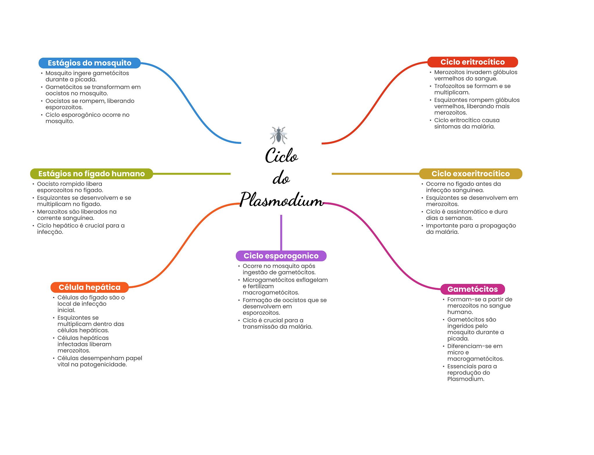 Estágios do mosquito Ciclo eritrocítico Mosquito ingere gametócitos Merozoitos invadem glóbulos durante a picada. vermelhos do sangue. Gametócitos se transformam em Trofozoítos se formam e se oocistos no mosquito. multiplicam. Oocistos se rompem, liberando Esquizontes rompem glóbulos esporozoitos. vermelhos, liberando mais Ciclo esporogônico ocorre no merozoitos. mosquito. Ciclo eritrocítico causa sintomas da malária. Ciclo Estágios no fígado humano do Ciclo exoeritrocítico Oocisto rompido libera Ocorre no fígado antes da esporozoitos no fígado. infecção sanguínea. Esquizontes se desenvolvem e se Plasmodium Esquizontes se desenvolvem em multiplicam no fígado. merozoitos. Merozoitos são liberados na Ciclo é assintomático e dura corrente sanguínea. dias a semanas. Ciclo hepático é crucial para a Importante para a propagação infecção. da malária. Ciclo esporogonico Ocorre no mosquito após ingestão de gametócitos. Microgametócitos exflagelam Célula hepática e fertilizam Gametócitos macrogametócitos. Células do fígado são Formação de oocistos que se Formam-se a partir de local de infecção desenvolvem em merozoitos no sangue inicial. esporozoitos. humano. Esquizontes se Ciclo é crucial para a Gametócitos são multiplicam dentro das transmissão da malária. ingeridos pelo células hepáticas. mosquito durante a Células hepáticas picada. infectadas liberam Diferenciam-se em merozoitos. micro e Células desempenham papel macrogametócitos. vital na patogenicidade. Essenciais para a reprodução do Plasmodium.