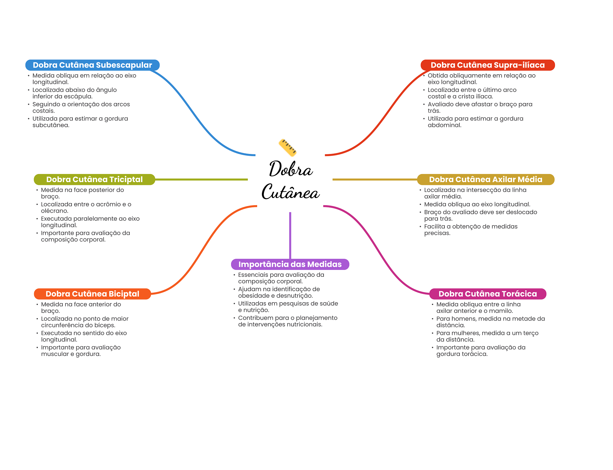 Dobra Cutânea Subescapular Dobra Cutânea Supra-ilíaca Medida oblíqua em relação ao eixo Obtida obliquamente em relação ao longitudinal. eixo longitudinal. Localizada abaixo do ângulo Localizada entre último arco inferior da escápula. costal e a crista ilíaca. Seguindo a orientação dos arcos Avaliado deve afastar braço para costais. trás. Utilizada para estimar a gordura Utilizada para estimar a gordura subcutânea. abdominal. Dobra Dobra Cutânea Triciptal Dobra Cutânea Axilar Média Medida na face posterior do braço. Cutânea Localizada na intersecção da linha axilar média. Localizada entre O acrômio e O Medida oblíqua ao eixo longitudinal. olécrano. Braço do avaliado deve ser deslocado Executada paralelamente ao eixo para trás. longitudinal. Facilita a obtenção de medidas Importante para avaliação da precisas. composição corporal. Importância das Medidas Essenciais para avaliação da composição corporal. Ajudam na identificação de Dobra Cutânea Biciptal obesidade e desnutrição. Dobra Cutânea Torácica Medida na face anterior do Utilizadas em pesquisas de saúde Medida oblíqua entre a linha braço. e nutrição. axilar anterior e mamilo. Localizada no ponto de maior Contribuem para planejamento Para homens, medida na metade da circunferência do biceps. de intervenções nutricionais. distância. Executada no sentido do eixo Para mulheres, medida a um terço longitudinal. da distância. Importante para avaliação Importante para avaliação da muscular e gordura. gordura torácica.